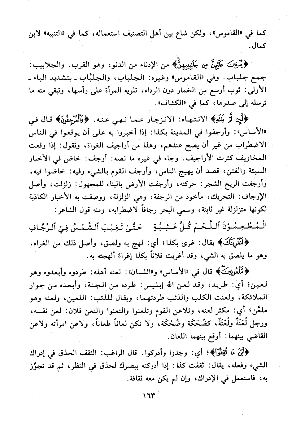 {يُدْنِينَ عَلَيْهِنَّ مِنْ جَلَابِيبِهِنَّ} من الإدناء من الدنو، وهو القرب. والجلابيب: جمع جلباب. وفي "القاموس" وغيره: الجلباب، والجلبَّاب - بتشديد الباء - الأولى: ثوب أوسع من الخمار دون الرداء، تلويه المرأة على رأسها، وتبقي منه ما ترسله إلى صدرها، كما في "الكشاف".
