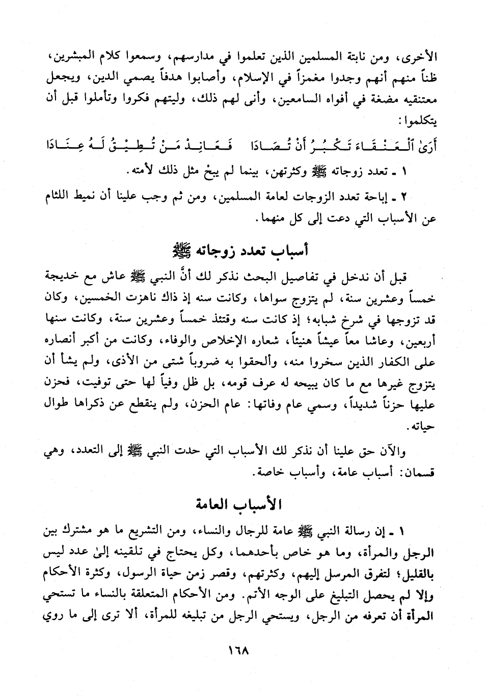 2 - إباحة تعدد الزوجات لعامة المسلمين، ومن ثم وجب علينا أن نميط اللثام عن الأسباب التي دعت إلى كل منهما.