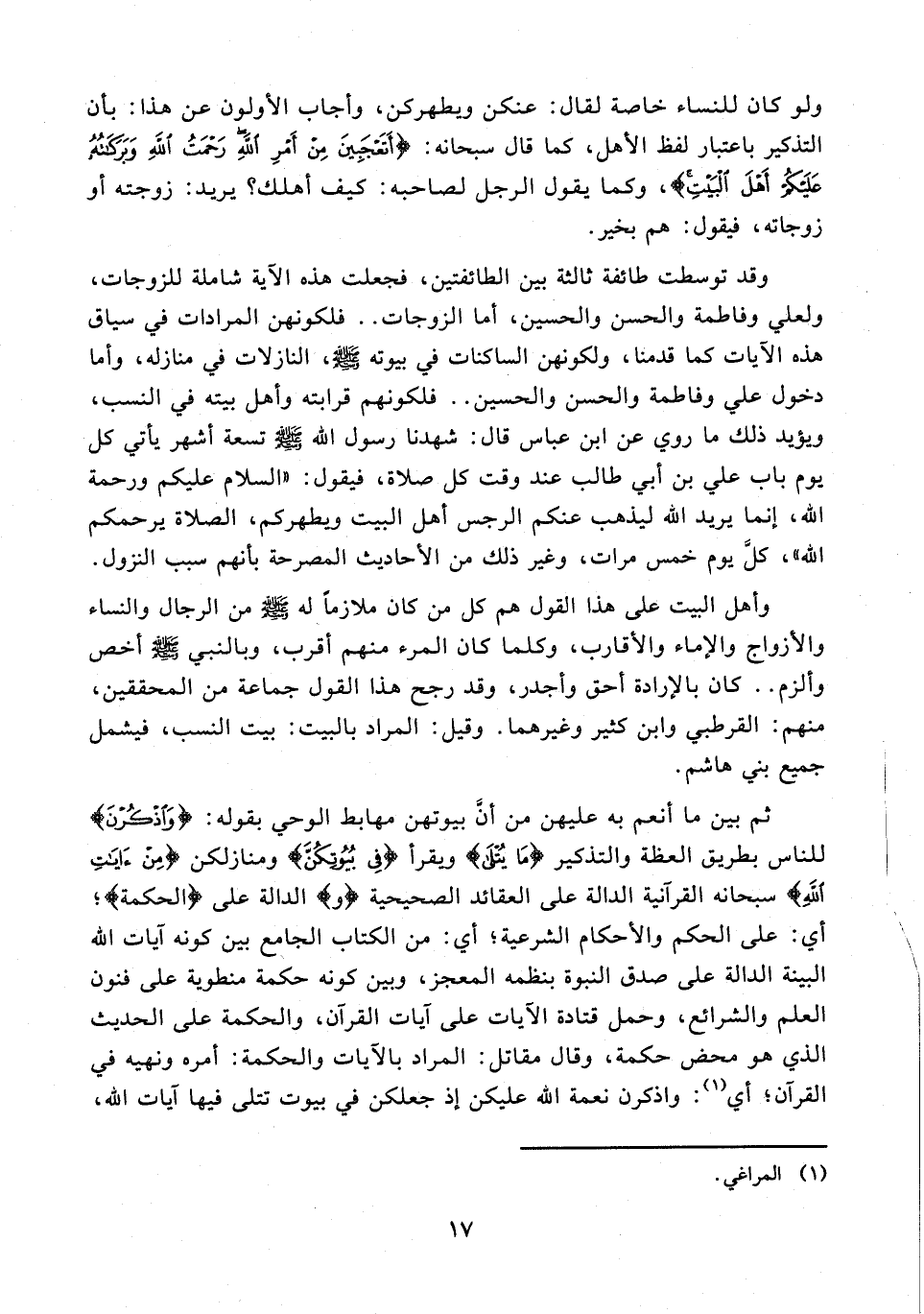 وقد توسطت طائفة ثالثة بين الطائفتين، فجعلت هذه الآية شاملة للزوجات، ولعلي وفاطمة والحسن والحسين، أما الزوجات .. فلكونهن المرادات في سياق هذه الآيات كما قدمنا, ولكونهن الساكنات في بيوته - صلى الله عليه وسلم -، النازلات في منازله، وأما دخول علي وفاطمة والحسن والحسين .. فلكونهم قرابته وأهل بيته في النسب، ويؤيد ذلك ما روي عن ابن عباس قال: شهدنا رسول الله تسعة أشهر يأتي كل يوم باب علي بن أبي طالب عند وقت كل صلاة، فيقول: "السلام عليكم ورحمة الله، إنما يريد الله ليذهب عنكم الرجس أهل البيت ويطهركم، الصلاة يرحمكم الله"، كلَّ يوم خمس مرات، وغير ذلك من الأحاديث المصرحة بأنهم سبب النزول.