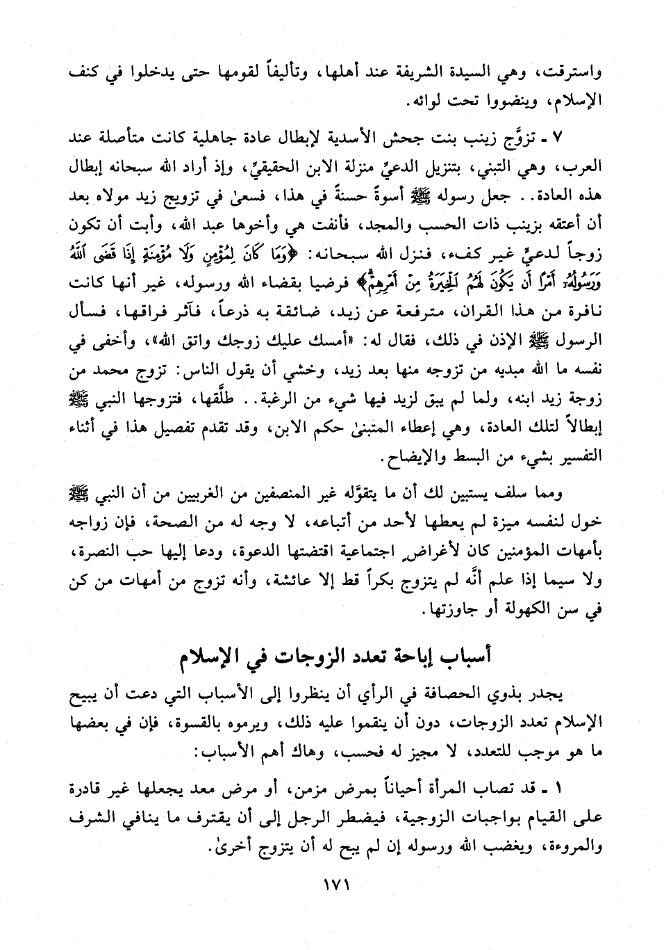 7 - تزوَّج زينب بنت جحش الأسدية لإبطال عادة جاهلية كانت متأصلة عند العرب، وهي التبني، بتنزيل الدعيِّ منزلة الابن الحقيقيِّ، وإذ أراد الله سبحانه إبطال هذه العادة .. جعل رسوله - صلى الله عليه وسلم - أسوةً حسنةً في هذا، فسعى في تزويج زيد مولاه بعد أن أعتقه بزينب ذات الحسب والمجد، فأنفت هي وأخوها عبد الله، وأبت أن تكون زوجًا لدعيٍّ غير كفء، فنزل الله سبحانه: {وَمَا كَانَ لِمُؤْمِنٍ وَلَا مُؤْمِنَةٍ إِذَا قَضَى اللَّهُ وَرَسُولُهُ أَمْرًا أَنْ يَكُونَ لَهُمُ الْخِيَرَةُ مِنْ أَمْرِهِمْ} فرضيا بقضاء الله ورسوله، غير أنها كانت نافرة من هذا القرآن، مترفعة عن زيد، ضائقة به ذرعًا، فآثر فراقها، فسأل الرسول - صلى الله عليه وسلم - الإذن في ذلك، فقال له: "أمسك عليك زوجك واتق الله"، وأخفى في نفسه ما الله مبديه من تزوجه منها بعد زيد، وخشي أن يقول الناس: تزوج محمد من زوجة زيد ابنه، ولما لم يبق لزيد فيها شيء من الرغبة .. طلَّقها، فتزوجها النبي - صلى الله عليه وسلم - إبطالًا لتلك العادة، وهي إعطاء المتبنى حكم الابن، وقد تقدم تفصيل هذا في أثناء التفسير بشيء من البسط والإيضاح.