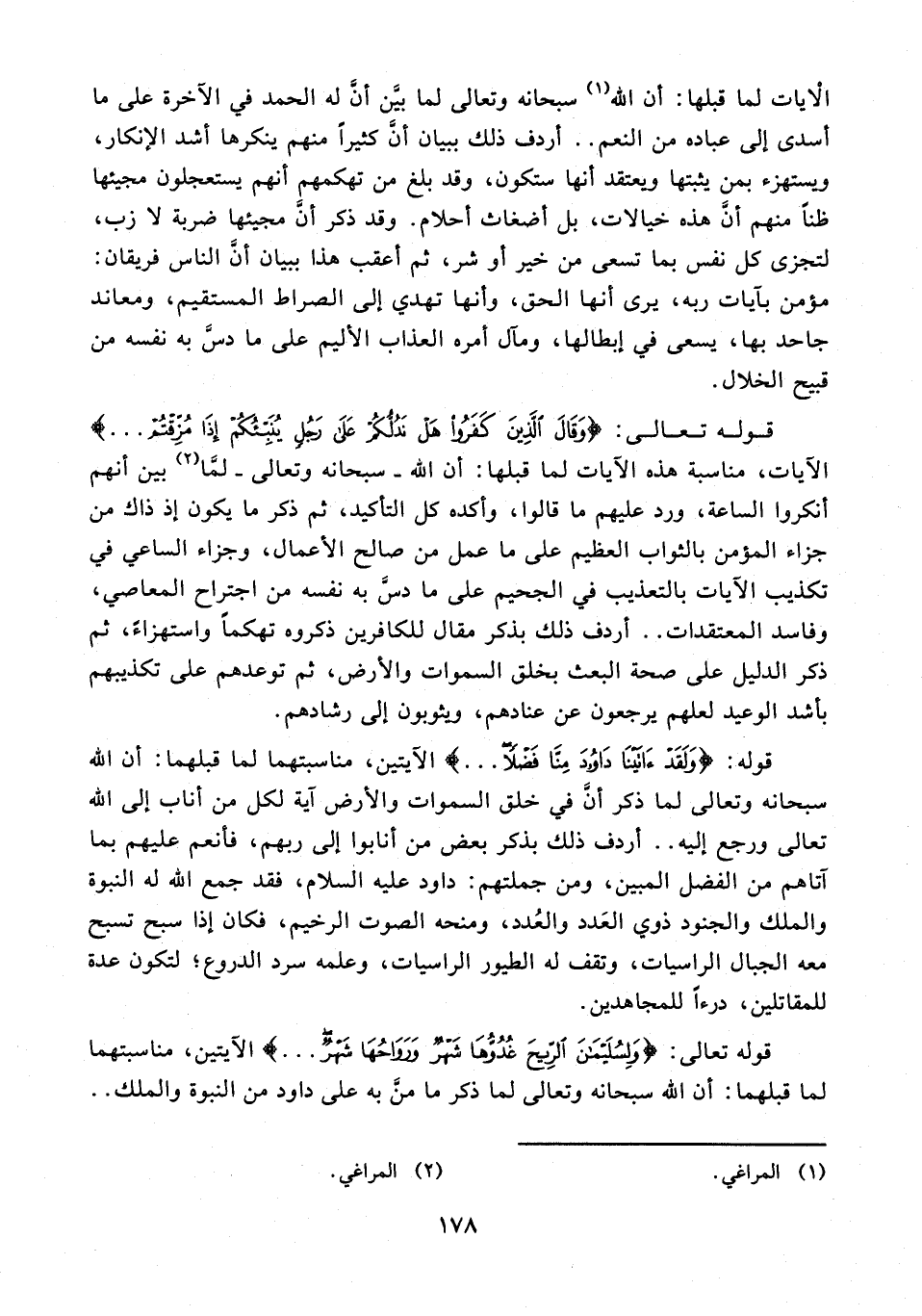 قوله: {وَلَقَدْ آتَيْنَا دَاوُودَ مِنَّا فَضْلًا ...} الآيتين، مناسبتهما لما قبلهما: أن الله سبحانه وتعالى لما ذكر أنَّ في خلق السموات والأرض آية لكل من أناب إلى الله تعالى ورجع إليه .. أردف ذلك بذكر بعض من أنابوا إلى ربهم، فأنعم عليهم بما آتاهم من الفضل المبين، ومن جملتهم: داود عليه السلام، فقد جمع الله له النبوة والملك والجنود ذوي العَدد والعُدد، ومنحه الصوت الرخيم، فكان إذا سبح تسبح معه الجبال الراسيات، وتقف له الطيور الراسيات، وعلمه سرد الدروع؛ لتكون عدة للمقاتلين، درءًا للمجاهدين.