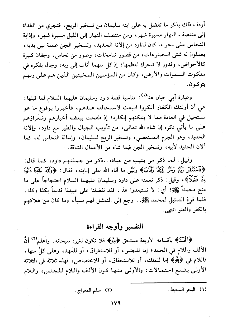 وعبارة أبي حيان هنا (¬1): مناسبة قصة داود وسليمان عليهما السلام لما قبلها: هي أن أولئك الكفار أنكروا البعث لاستحالته عندهم، فأخبروا بوقوع ما هو مستحيل في العادة مما لا يمكنهم إنكاره؛ إذ طفحت ببعضه أخبارهم وشعراؤهم على ما يأتي ذكره إن شاء الله تعالى، من تأويب الجبال والطير مع داود، وإلانة الحديد، وهو الجرم المستعصي، وتسخير الريح لسليمان، وإسالة النحاس له، كما ألان الحديد لأبيه، وتسخير الجن فيما شاء من الأعمال الشاقة.