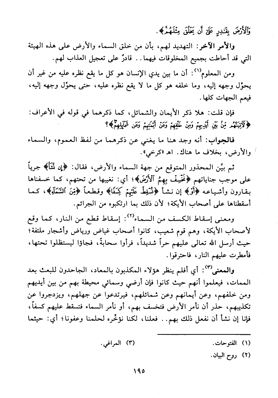 والمعنى (¬3): أي أفلم ينظر هؤلاء المكذبون بالمعاد، الجاحدون للبعث بعد الممات، فيعلموا أنهم حيث كانوا فإن أرضي وسمائي محيطة بهم من بين أيديهم ومن خلفهم، وعن أيمانهم وعن شمائلهم، فيرتدعوا عن جهلهم، ويزدجروا عن تكذيبهم، حذر أن نأمر الأرض فتخسف بهم، أو نأمر السماء فتسقط عليهم كسفًا، فإنا إن نشأ أن نفعل ذلك بهم .. فعلنا، لكنا نؤخِّره لحلمنا وعفونا؛ أي: حيثما