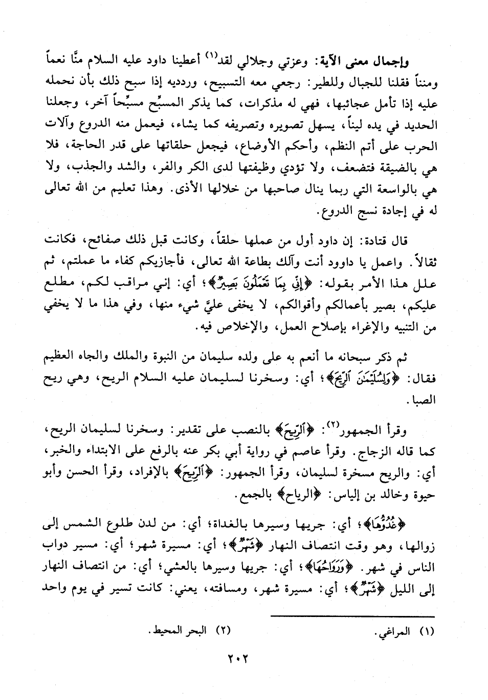 12 - ثم ذكر سبحانه ما أنعم به على ولده سليمان من النبوة والملك والجاه العظيم فقال: {وَلِسُلَيْمَانَ الرِّيحَ}؛ أي: وسخرنا لسليمان عليه السلام الريح، وهي ريح الصبا.