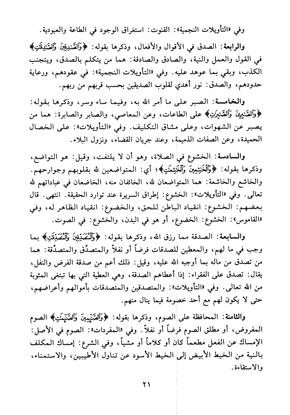 والرابعة: الصدق في الأقوال والأفعال، وذكرها بقوله: {وَالصَّادِقِينَ وَالصَّادِقَاتِ} في القول والعمل والنية، والصادق والصادقة: هما من يتكلم بالصدق، ويتجنب الكذب، وبقي بما عوهد عليه. وفي "التأويلات النجمية": في عقودهم، ورعاية حدودهم، والصدق: نور أهدي لقلوب الصديقين بحسب قربم من ربهم.