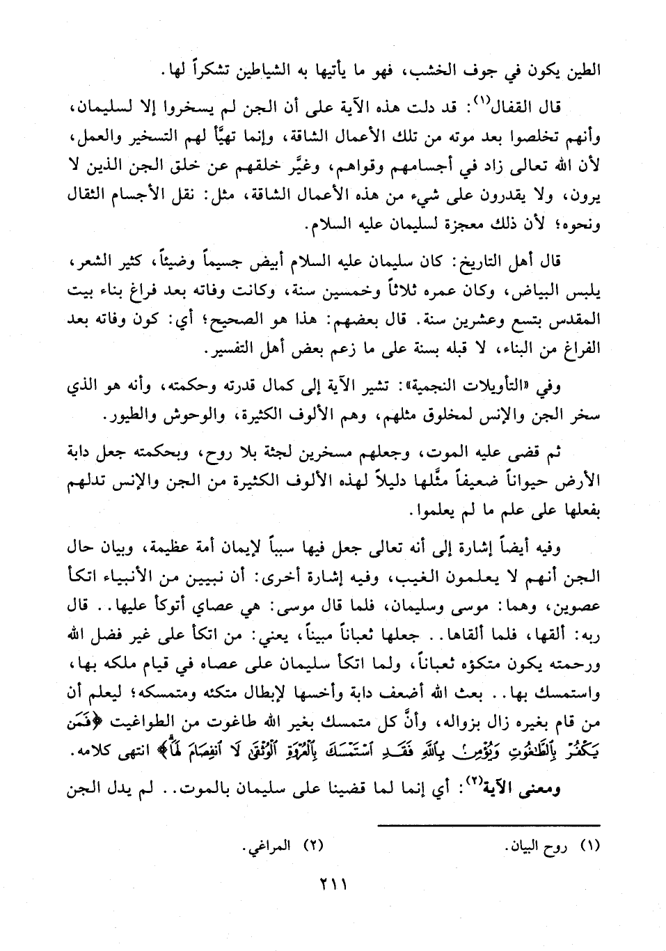 وفيه أيضًا إشارة إلى أنه تعالى جعل فيها سببًا لإيمان أمة عظيمة، وبيان حال الجن أنهم لا يعلمون الغيب، وفيه إشارة أخرى: أن نبيين من الأنبياء اتكأ عصوين، وهما: موسى وسليمان، فلما قال موسى: هي عصاي أتوكأ عليها .. قال ربه: ألقها، فلما ألقاها .. جعلها ثعبانًا مبينًا، يعني: من اتكأ على غير فضل الله ورحمته يكون متكؤه ثعبانًا، ولما اتكأ سليمان على عصاه في قيام ملكه بها، واستمسك بها .. بعث الله أضعف دابة وأخسها لإبطال متكئه ومتمسكه؛ ليعلم أن من قام بغيره زال بزواله، وأنَّ كل متمسك بغير الله طاغوت من الطواغيت {فَمَنْ يَكْفُرْ بِالطَّاغُوتِ وَيُؤْمِنْ بِاللَّهِ فَقَدِ اسْتَمْسَكَ بِالْعُرْوَةِ الْوُثْقَى لَا انْفِصَامَ لَهَا} انتهى كلامه.