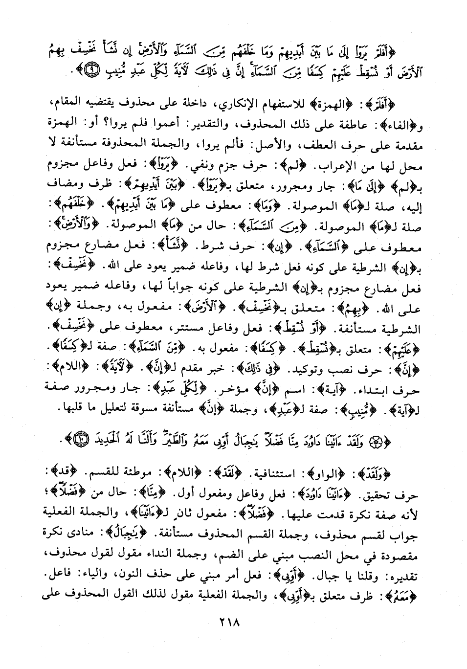 {أَفَلَمْ}: {الهمزة} للاستفهام الإنكاري، داخلة على محذوف يقتضيه المقام، و {الفاء}: عاطفة على ذلك المحذوف، والتقدير: أعموا فلم يروا؟ أو: الهمزة مقدمة على حرف العطف، والأصل: فألم يروا، والجملة المحذوفة مستأنفة لا محل لها من الإعراب. {لم}: حرف جزم ونفي. {يَرَوْا}: فعل وفاعل مجزوم بـ {لم} {إِلَى مَا}: جار ومجرور، متعلق بـ {يَرَوْا}. {بَيْنَ أَيْدِيهِمْ}: ظرف ومضاف إليه، صلة لـ {مَا} الموصولة. {وَمَا}: معطوف على {مَا بَيْنَ أَيْدِيهِمْ}. {خَلْفَهُمْ}: صلة لـ {مَا} الموصولة. {مِنَ السَّمَاءِ}: حال من {مَا} الموصولة. {وَالْأَرْضِ}: معطوف على {السَّمَاءِ}. {إِنْ}: حرف شرط. {نَشَأْ}: فعل مضارع مجزوم بـ {إِن} الشرطية على كونه فعل شرط لها، وفاعله ضمير يعود على الله. {نَخْسِفْ}: فعل مضارع مجزوم بـ {إِن} الشرطية على كونه جوابًا لها، وفاعله ضمير يعود على الله. {بِهِمُ}: متعلق بـ {نَخْسِفْ}. {الْأَرْضِ}: مفعول به، وجملة {إِن} الشرطية مستأنفة. {أَوْ نُسْقِطْ}: فعل وفاعل مستتر، معطوف على {نَخْسِفْ}. {عَلَيْهِمْ}: متعلق بـ {نُسْقِطْ}. {كِسَفًا}: مفعول به. {مِنَ السَّمَاءِ}: صفة لـ {كِسَفًا}. {إِنَّ}: حرف نصب وتوكيد. {فِي ذَلِكَ}: خبر مقدم لـ {إِنَّ}. {لَآيَةً}: {اللام}: حرف ابتداء. {آيَةً}: اسم {إنَّ} مؤخر. {لِكُلِّ عَبْدٍ}: جار ومجرور صفة لـ {آية}. {مُنِيبٍ}: صفة لـ {عَبْدٍ}، وجملة {إِنَّ} مستأنفة مسوقة لتعليل ما قلبها.
