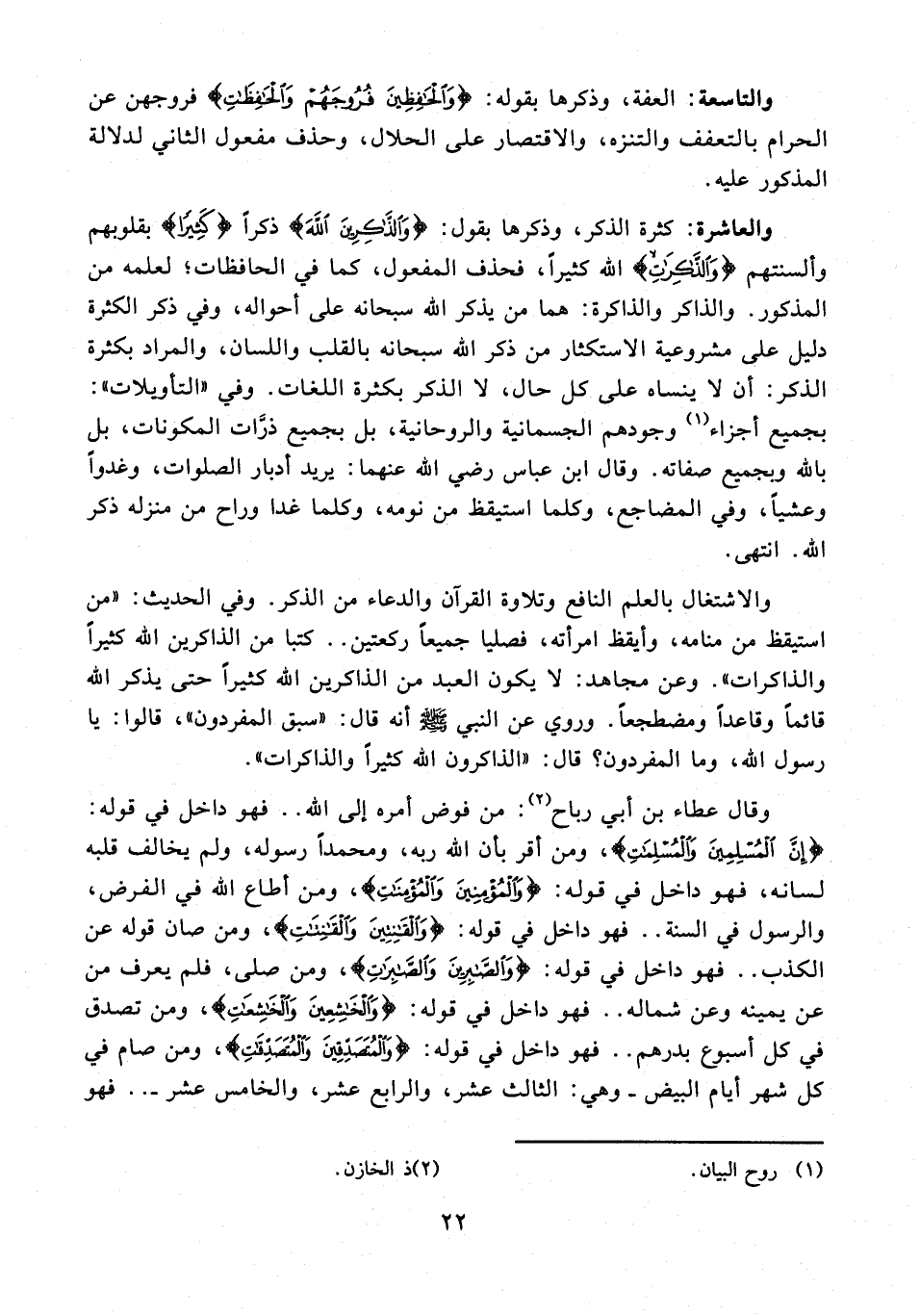 والعاشرة: كثرة الذكر، وذكرها بقول: {وَالذَّاكِرِينَ اللَّهَ} ذكرًا {كَثِيرًا} بقلوبهم وألسنتهم {وَالذَّاكِرَاتِ} الله كثيرًا، فحذف المفعول، كما في الحافظات؛ لعلمه من المذكور. والذاكر والذاكرة: هما من يذكر الله سبحانه على أحواله، وفي ذكر الكثرة دليل على مشروعية الاستكثار من ذكر الله سبحانه بالقلب واللسان، والمراد بكثرة الذكر: أن لا ينساه على كل حال، لا الذكر بكثرة اللغات. وفي "التأويلات": بجميع أجزاء (¬1) وجودهم الجسمانية والروحانية، بل بجميع ذرَّات المكونات، بل بالله وبجميع صفاته. وقال ابن عباس رضي الله عنهما: يريد أدبار الصلوات، وغدوًا وعشيًا، وفي المضاجع، وكلما استيقظ من نومه، وكلما غدا وراح من منزله ذكر الله. انتهى.