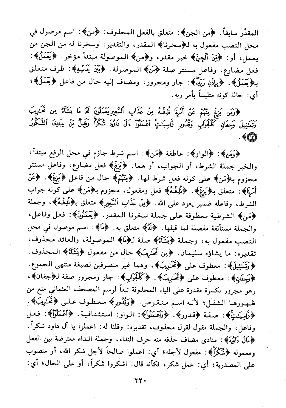 {وَمَنْ}: {الواو}: عاطفة {مَنْ}: اسم شرط جازم في حل الرفع مبتدأ، والخبر جملة الشرط، أو الجواب، أو هما. {يَزِغْ} فعل مضارع، وفاعل مستتر مجزوم بـ {مَن} على كونه فعل شرط لها. {مِنْهُمْ} حال من فاعل {يَزِغْ}. {عَنْ أَمْرِنَا}: متعلق بـ {يَزِغْ}. {نُذِقْهُ} فعل ومفعول، مجزوم بـ {مَن} على كونه جواب الشرط، وفاعله ضمير يعود على الله. {مِنْ عَذَابِ السَّعِير} متعلق بـ {نُذِقْهُ}، وجملة {مِنْ} الشرطية معطوفة على جملة سخرنا المقدر. {يَعْمَلُونَ}: فعل وفاعل، والجملة مستأنفة مفصلة لما قبلها {لَهُ} متعلق به. {مَا}: اسم موصول في محل النصب مفعول به، وجملة {يَشَاءُ} صلة لـ {مَا} الموصولة، والعائد محذوف، تقديره: ما يشاؤه سليمان. {مِنْ مَحَارِيبَ} حال من مفعول {يَشَاءُ} المحذوف. {وَتَمَاثِيلَ}: معطوف على {مَحَارِيبَ}، وهما غير منصرفين لصيغة منتهى الجموع. {وَجِفَانٍ}: معطوف على {مَحَارِيبَ}. {كَالْجَوَابِ}: جار ومجرور صفة لـ {جفان}، وهو مجرور بكسرة مقدرة على الياء المحذوفة تبعًا لرسم المصحف العثماني منع من ظهورها الثقل؛ لأنه اسم منقوص. {وَقُدُورٍ} معطوف على {مَحَارِيبَ}. {رَاسِيَاتٍ}: صفة {قدور}. {وَاعْمَلُوا}: الواو: استئنافية. {اعْمَلُوا}: فعل وفاعل، والجملة مقول لقول محذوف، تقديره: وقلنا له: اعملوا يا آل داود شكرًا. {آلَ دَاوُودَ}: منادى مضاف حذفه منه حرف النداء، وجملة النداء معترضة بين الفعل ومعموله {شُكْرًا}: مفعول لأجله؛ أي: اعملوا صالحًا لأجل شكر الله، أو منصوب على المصدرية؛ أي: عمل شكر، فكأنه قال: اشكروا شكرًا، أو على الحال؛ أي: