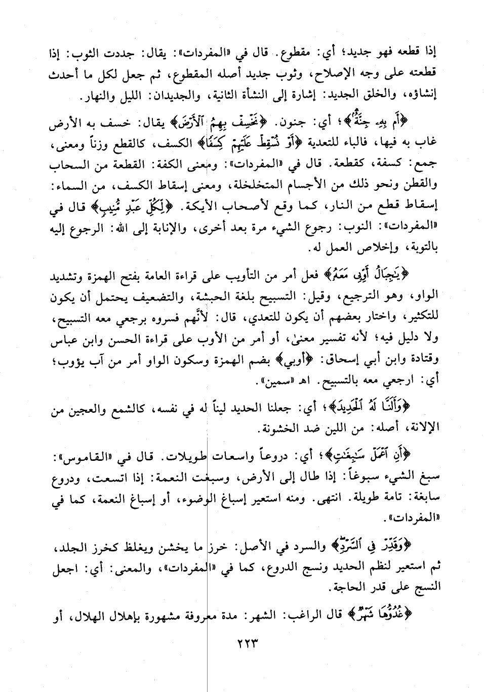 {أَنِ اعْمَلْ سَابِغَاتٍ}؛ أي: دروعًا واسعات طويلات. قال في "القاموس": سبغ الشيء سبوغًا: إذا طال إلى الأرض، وسبغت النعمة: إذا اتسعت، ودروع سابغة: تامة طويلة. انتهى. ومنه استعير إسباغ الضوء، أو إسباغ النعمة، كما في "المفردات".
