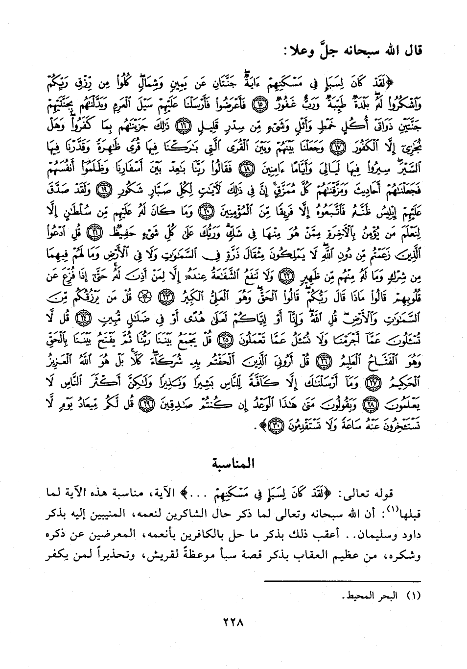 {لَقَدْ كَانَ لِسَبَإٍ فِي مَسْكَنِهِمْ آيَةٌ جَنَّتَانِ عَنْ يَمِينٍ وَشِمَالٍ كُلُوا مِنْ رِزْقِ رَبِّكُمْ وَاشْكُرُوا لَهُ بَلْدَةٌ طَيِّبَةٌ وَرَبٌّ غَفُورٌ (15) فَأَعْرَضُوا فَأَرْسَلْنَا عَلَيْهِمْ سَيْلَ الْعَرِمِ وَبَدَّلْنَاهُمْ بِجَنَّتَيْهِمْ جَنَّتَيْنِ ذَوَاتَيْ أُكُلٍ خَمْطٍ وَأَثْلٍ وَشَيْءٍ مِنْ سِدْرٍ قَلِيلٍ (16) ذَلِكَ جَزَيْنَاهُمْ بِمَا كَفَرُوا وَهَلْ نُجَازِي إِلَّا الْكَفُورَ (17) وَجَعَلْنَا بَيْنَهُمْ وَبَيْنَ الْقُرَى الَّتِي بَارَكْنَا فِيهَا قُرًى ظَاهِرَةً وَقَدَّرْنَا فِيهَا السَّيْرَ سِيرُوا فِيهَا لَيَالِيَ وَأَيَّامًا آمِنِينَ (18) فَقَالُوا رَبَّنَا بَاعِدْ بَيْنَ أَسْفَارِنَا وَظَلَمُوا أَنْفُسَهُمْ فَجَعَلْنَاهُمْ أَحَادِيثَ وَمَزَّقْنَاهُمْ كُلَّ مُمَزَّقٍ إِنَّ فِي ذَلِكَ لَآيَاتٍ لِكُلِّ صَبَّارٍ شَكُورٍ (19) وَلَقَدْ صَدَّقَ عَلَيْهِمْ إِبْلِيسُ ظَنَّهُ فَاتَّبَعُوهُ إِلَّا فَرِيقًا مِنَ الْمُؤْمِنِينَ (20) وَمَا كَانَ لَهُ عَلَيْهِمْ مِنْ سُلْطَانٍ إِلَّا لِنَعْلَمَ مَنْ يُؤْمِنُ بِالْآخِرَةِ مِمَّنْ هُوَ مِنْهَا فِي شَكٍّ وَرَبُّكَ عَلَى كُلِّ شَيْءٍ حَفِيظٌ (21) قُلِ ادْعُوا الَّذِينَ زَعَمْتُمْ مِنْ دُونِ اللَّهِ لَا يَمْلِكُونَ مِثْقَالَ ذَرَّةٍ فِي السَّمَاوَاتِ وَلَا فِي الْأَرْضِ وَمَا لَهُمْ فِيهِمَا مِنْ شِرْكٍ وَمَا لَهُ مِنْهُمْ مِنْ ظَهِيرٍ (22) وَلَا تَنْفَعُ الشَّفَاعَةُ عِنْدَهُ إِلَّا لِمَنْ أَذِنَ لَهُ حَتَّى إِذَا فُزِّعَ عَنْ قُلُوبِهِمْ قَالُوا مَاذَا قَالَ رَبُّكُمْ قَالُوا الْحَقَّ وَهُوَ الْعَلِيُّ الْكَبِيرُ (23) قُلْ مَنْ يَرْزُقُكُمْ مِنَ السَّمَاوَاتِ وَالْأَرْضِ قُلِ اللَّهُ وَإِنَّا أَوْ إِيَّاكُمْ لَعَلَى هُدًى أَوْ فِي ضَلَالٍ مُبِينٍ (24) قُلْ لَا تُسْأَلُونَ عَمَّا أَجْرَمْنَا وَلَا نُسْأَلُ عَمَّا تَعْمَلُونَ (25) قُلْ يَجْمَعُ بَيْنَنَا رَبُّنَا ثُمَّ يَفْتَحُ بَيْنَنَا بِالْحَقِّ وَهُوَ الْفَتَّاحُ الْعَلِيمُ (26) قُلْ أَرُونِيَ الَّذِينَ أَلْحَقْتُمْ بِهِ شُرَكَاءَ كَلَّا بَلْ هُوَ اللَّهُ الْعَزِيزُ الْحَكِيمُ (27) وَمَا أَرْسَلْنَاكَ إِلَّا كَافَّةً لِلنَّاسِ بَشِيرًا وَنَذِيرًا وَلَكِنَّ أَكْثَرَ النَّاسِ لَا يَعْلَمُونَ (28) وَيَقُولُونَ مَتَى هَذَا الْوَعْدُ إِنْ كُنْتُمْ صَادِقِينَ (29) قُلْ لَكُمْ مِيعَادُ يَوْمٍ لَا تَسْتَأْخِرُونَ عَنْهُ سَاعَةً وَلَا تَسْتَقْدِمُونَ (30)}