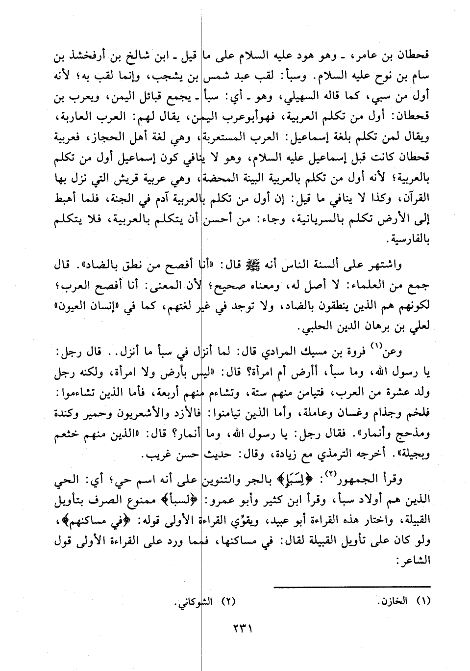 قحطان بن عامر، - وهو هود عليه السلام على ما قيل - ابن شالخ بن أرفخشذ بن سام بن نوح عليه السلام. وسبأ: لقب عبد شمس بن يشجب، وإنما لقب به؛ لأنه أول من سبي، كما قاله السهيلي، وهو - أي: سبأ - يجمع قبائل اليمن، ويعرب بن قحطان: أول من تكلم العربية، فهو أبو عرب اليمن، يقال لهم: العرب العاربة، ويقال لمن تكلم بلغة إسماعيل: العرب المستعربة، وهي لغة أهل الحجاز، فعربية قحطان كانت قبل إسماعيل عليه السلام، وهو لا ينافي كون إسماعيل أول من تكلم بالعربية؛ لأنه أول من تكلم بالعربية البينة المحضة، وهي عربية قريش التي نزل بها القرآن، وكذا لا ينافي ما قيل: إن أول من تكلم بالعربية آدم في الجنة، فلما أهبط إلى الأرض تكلم بالسريانية، وجاء: من أحسن أن يتكلم بالعربية، فلا يتكلم بالفارسية.