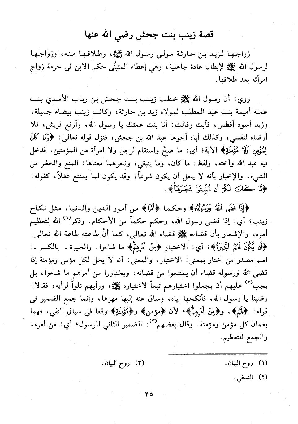 36 - زواجها لزيد بن حارثة مولى رسول الله، وطلاقها منه، وزواجها لرسول الله - صلى الله عليه وسلم - لإبطال عادة جاهلية، وهي إعطاء المتبنَّى حكم الابن في حرمة زواج امرأته بعد طلاقها.