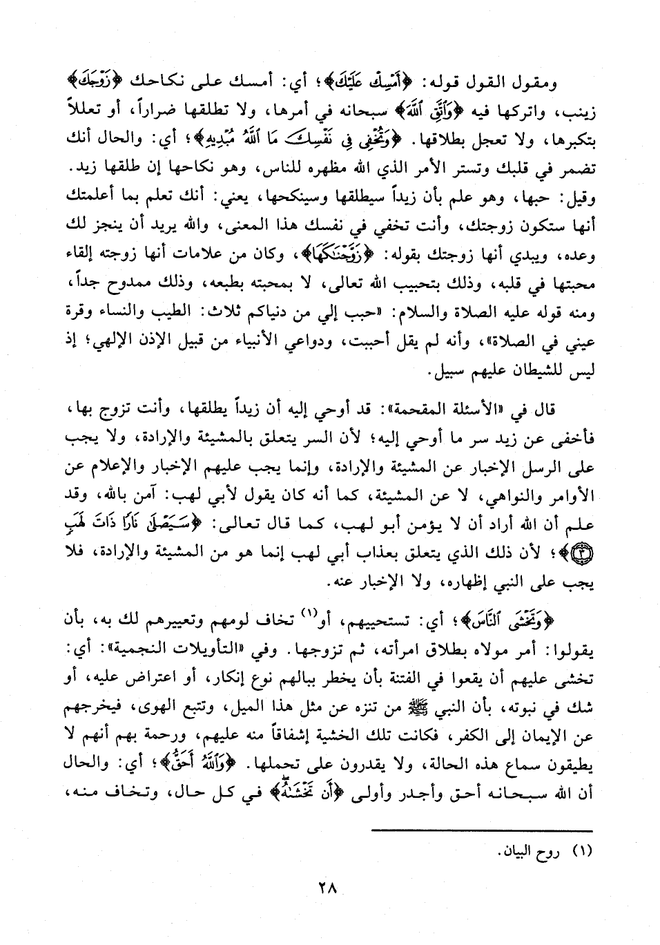 قال في "الأسئلة المقحمة": قد أوحي إليه أن زيدًا يطلقها، وأنت تزوج بها، فأخفى عن زيد سر ما أوحي إليه؛ لأن السر يتعلق بالمشيئة والإرادة، ولا يجب على الرسل الإخبار عن المشيئة والإرادة، وإنما يجب عليهم الإخبار والإعلام عن الأوامر والنواهي، لا عن المشيئة، كما أنه كان يقول لأبي لهب: آمن بالله، وقد علم أن الله أراد أن لا يؤمن أبو لهب، كما قال تعالى: {سَيَصْلَى نَارًا ذَاتَ لَهَبٍ (3)}؛ لأن ذلك الذي يتعلق بعذاب أبي لهب إنما هو من المشيئة والإرادة، فلا يجب على النبي إظهاره، ولا الإخبار عنه.