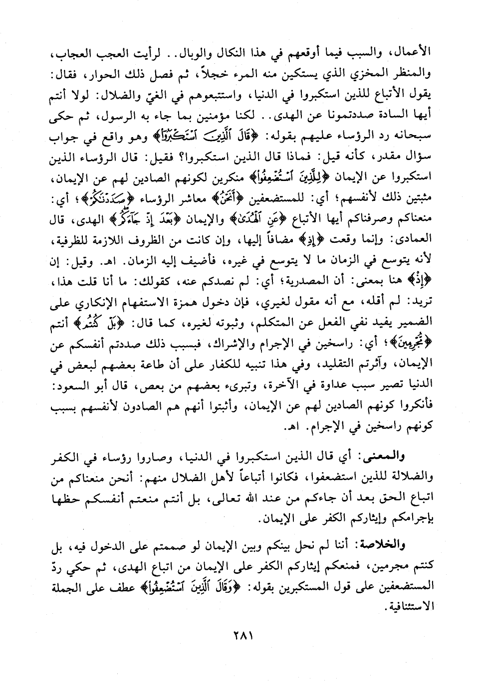 الأعمال، والسبب فيما أوقعهم في هذا النكال والوبال .. لرأيت العجب العجاب، والمنظر المخزي الذي يستكين منه المرء خجلًا، ثم فصل ذلك الحوار، فقال: يقول الأتباع للذين استكبروا في الدنيا، واستتبعوهم في الغيّ والضلال: لولا أنتم أيها السادة صددتمونا عن الهدى .. لكنا مؤمنين بما جاء به الرسول،