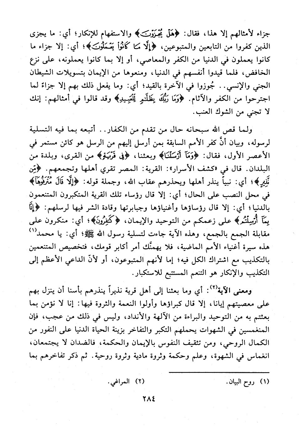 ومعنى الآية (¬2): أي وما بعثنا إلى أهل قرية نذيرًا ينذرهم بأسنا أن ينزل بهم على معصيتهم إيانا، إلا قال كبراؤها وأولوا النعمة والثروة فيها: إنا لا نؤمن بما بعثتم به من التوحيد والبراءة من الآلهة والأنداد، وليس في ذلك من عجيب، فإن المنغمسين في الشهوات يحملهم التكبر والتفاخر بزينة الحياة الدنيا على النفور من الكمال الروحي، ومن تثقيف النفوس بالإيمان والحكمة، فالضدان لا يجتمعان، انغماس في الشهوة، وعلم وحكمة وثروة مادية وثروة روحية.