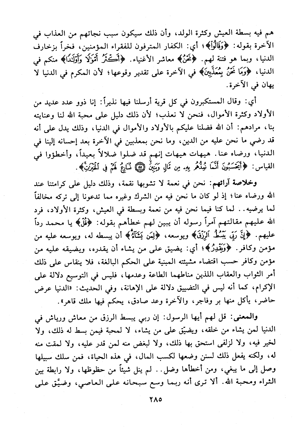 والمعنى: قل لهم أيها الرسول: إن ربي يبسط الرزق من معاش ورياش في الدنيا لمن يشاء من خلقه، ويضيّق على من يشاء، لا لمحبة فيمن بسط له ذلك، ولا لخير فيه، ولا لزلفى استحق بها ذلك، ولا لبغض منه لمن قدر عليه، ولا لمقت منه له، ولكنه يفعل ذلك لسنن وضعها لكسب المال، في هذه الحياة، فمن سلك سبيلها وصل إلى ما يبغي، ومن أخطأها وضل .. لم ينل شيئًا من حظوظها, ولا رابطة بين الثراء ومحبة الله. ألا ترى أنه ربما وسع سبحانه على العاصي، وضيَّق على