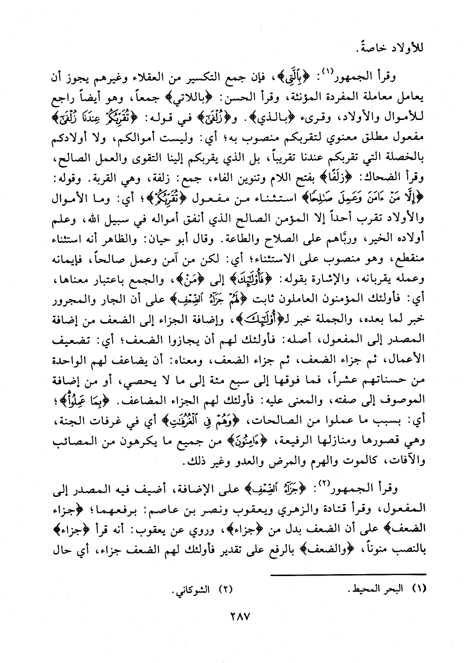 وقرأ الجمهور (¬1): {بِالَّتِي}، فإن جمع التكسير من العقلاء وغيرهم يجوز أن يعامل معاملة المفردة المؤنثة، وقرأ الحسن: {باللاتي} جمعًا، وهو أيضًا راجع للأموال والأولاد، وقرىء {بالذي}. و {زُلْفَى} في قوله: {تُقَرِّبُكُمْ عِنْدَنَا زُلْفَى} مفعول مطلق معنوي لتقربكم منصوب به؛ أي: وليست أموالكم، ولا أولادكم بالخصلة التي تقربكم عندنا تقريبًا، بل الذي يقربكم إلينا التقوى والعمل الصالح، وقرأ الضحاك: {زلَفًا} بفتح اللام وتنوين الفاء، جمع: زلفة، وهي القربة. وقوله: {إِلَّا مَنْ آمَنَ وَعَمِلَ صَالِحًا} استثناء من مفعول {تُقَرِّبُكُمْ}؛ أي: وما الأموال والأولاد تقرب أحدًا إلا المؤمن الصالح الذي أنفق أمواله في سبيل الله، وعلم أولاده الخير، وربَّاهم على الصلاح والطاعة. وقال أبو حيان: والظاهر أنه استثناء منقطع، وهو منصوب على الاستثناء؛ أي: لكن من آمن وعمل صالحًا، فإيمانه وعمله يقربانه، والإشارة بقوله: {فَأُولَئِكَ} إلى {مَنْ}، والجمع باعتبار معناها، أي: فأولئك المؤمنون العاملون ثابت {لَهُمْ جَزَاءُ الضِّعْفِ} على أن الجار والمجرور خبر لما بعده، والجملة خبر لـ {أُولَئِكَ}، وإضافة الجزاء إلى الضعف من إضافة المصدر إلى المفعول، أصله: فأولئك لهم أن يجازوا الضعف؛ أي: تضعيف الأعمال، ثم جزاء الضعف، ثم جزاء الضعف، ومعناه: أن يضاعف لهم الواحدة من حسناتهم عشرًا، فما فوقها إلى سبع مئة إلى ما لا يحصى، أو من إضافة الموصوف إلى صفته، والمعنى عليه: فأولئك لهم الجزاء المضاعف. {بِمَا عَمِلُوا}؛ أي: بسبب ما عملوا من الصالحات، {وَهُمْ فِي الْغُرُفَاتِ} أي في غرفات الجنة، وهي قصورها ومنازلها الرفيعة، {آمِنُونَ} من جميع ما يكرهون من المصائب والآفات، كالموت والهرم والمرض والعدو وغير ذلك.