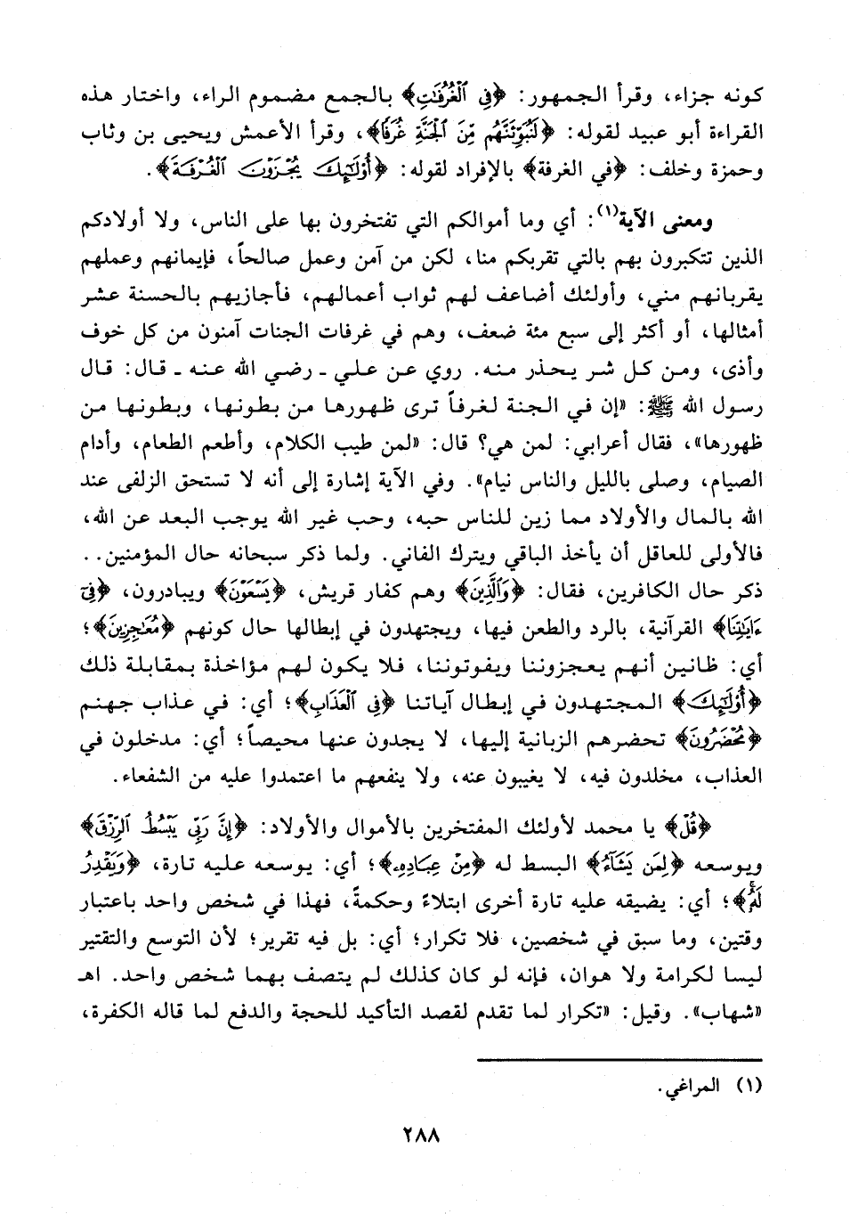 ومعنى الآية (¬1): أي وما أموالكم التي تفتخرون بها على الناس، ولا أولادكم الذين تتكبرون بهم بالتي تقربكم منا، لكن من آمن وعمل صالحًا، فإيمانهم وعملهم يقربانهم منى، وأولئك أضاعف لهم ثواب أعمالهم، فأجازيهم بالحسنة عشر أمثالها، أو أكثر إلى سبع مئة ضعف، وهم في غرفات الجنات آمنون من كل خوف وأذى، ومن كل شر يحذر منه. روي عن علي - رضي الله عنه - قال: قال رسول الله - صلى الله عليه وسلم -: "إن في الجنة لغرفًا ترى ظهورها من بطونها، وبطونها من ظهورها"، فقال أعرابي: لمن هي؟ قال: "لمن طيب الكلام، وأطعم الطعام، وأدام الصيام، وصلى بالليل والناس نيام". وفي الآية إشارة إلى أنه لا تستحق الزلفى عند الله بالمال والأولاد مما زين للناس حبه، وحب غير الله يوجب البعد عن الله، فالأولى للعاقل أن يأخذ الباقي ويترك الفاني.