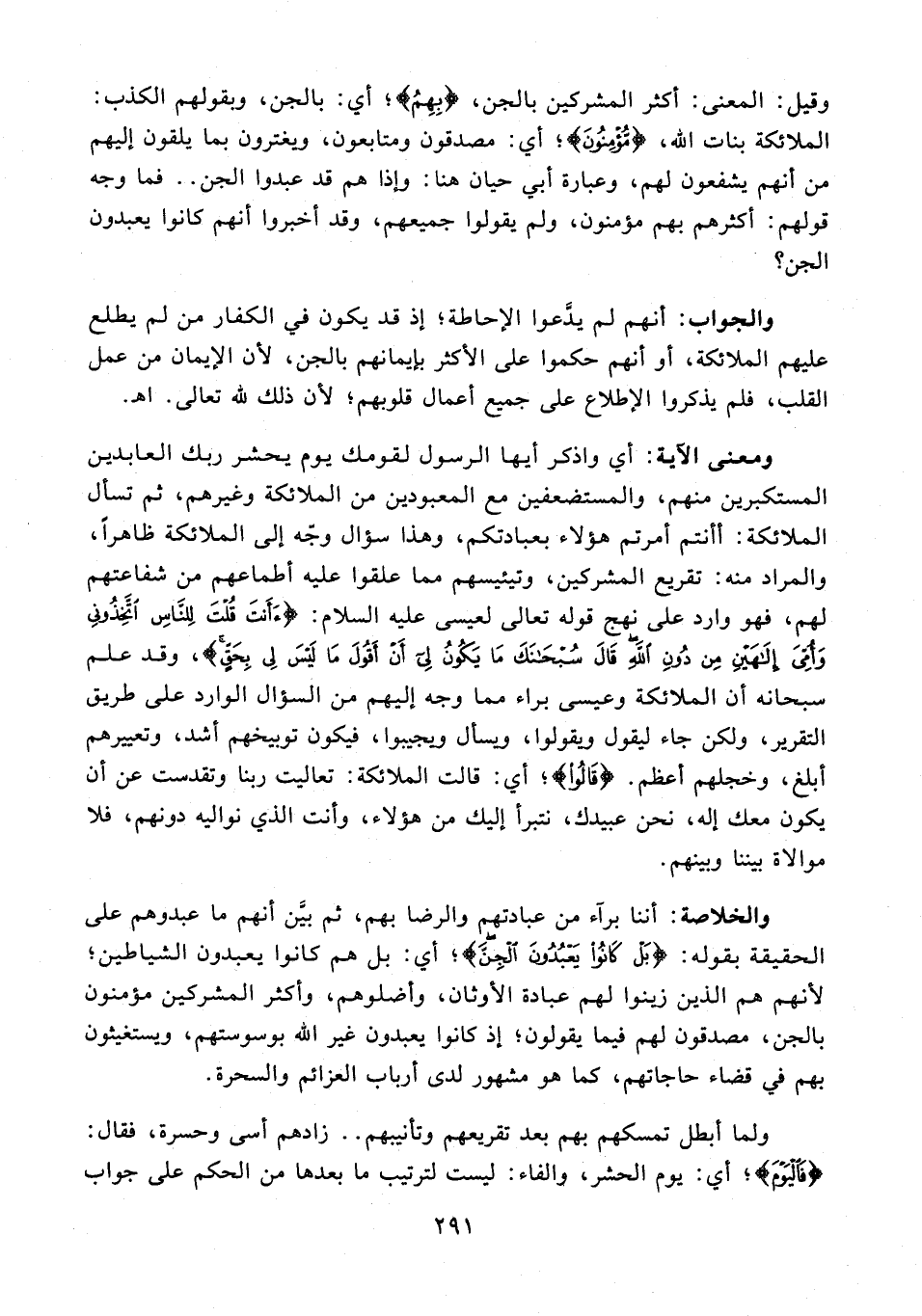 والخلاصة: أننا برآء من عبادتهم والرضا بهم، ثم بيَّن أنهم ما عبدوهم على الحقيقة بقوله: {بَلْ كَانُوا يَعْبُدُونَ الْجِنَّ}؛ أي: بل هم كانوا يعبدون الشياطين؛ لأنهم هم الذين زينوا لهم عبادة الأوثان، وأضلوهم، وأكثر المشركين مؤمنون بالجن، مصدقون لهم فيما يقولون؛ إذ كانوا يعبدون غير الله بوسوستهم، ويستغيثون بهم في قضاء حاجاتهم، كما هو مشهور لدى أرباب العزائم والسحرة.