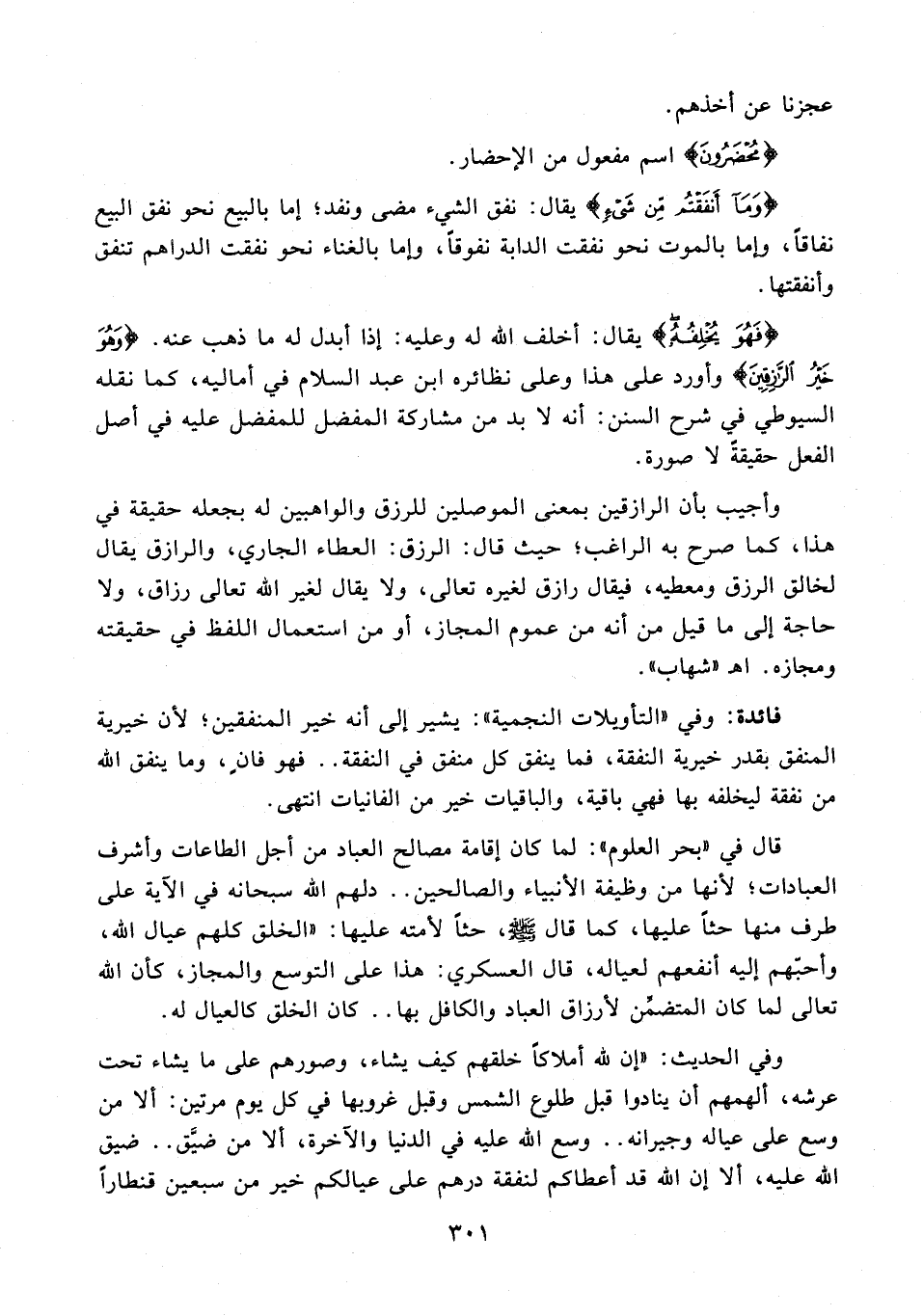 قال في "بحر العلوم": لما كان إقامة مصالح العباد من أجل الطاعات وأشرف العبادات؛ لأنها من وظيفة الأنبياء والصالحين .. دلهم الله سبحانه في الآية على طرف منها حثًا عليها، كما قال - صلى الله عليه وسلم -، حثًا لأمته عليها: "الخلق كلهم عيال الله، وأحبّهم إليه أنفعهم لعياله، قال العسكري: هذا على التوسع والمجاز، كأن الله تعالى لما كان المتضمِّن لأرزاق العباد والكافل بها .. كان الخلق كالعيال له.