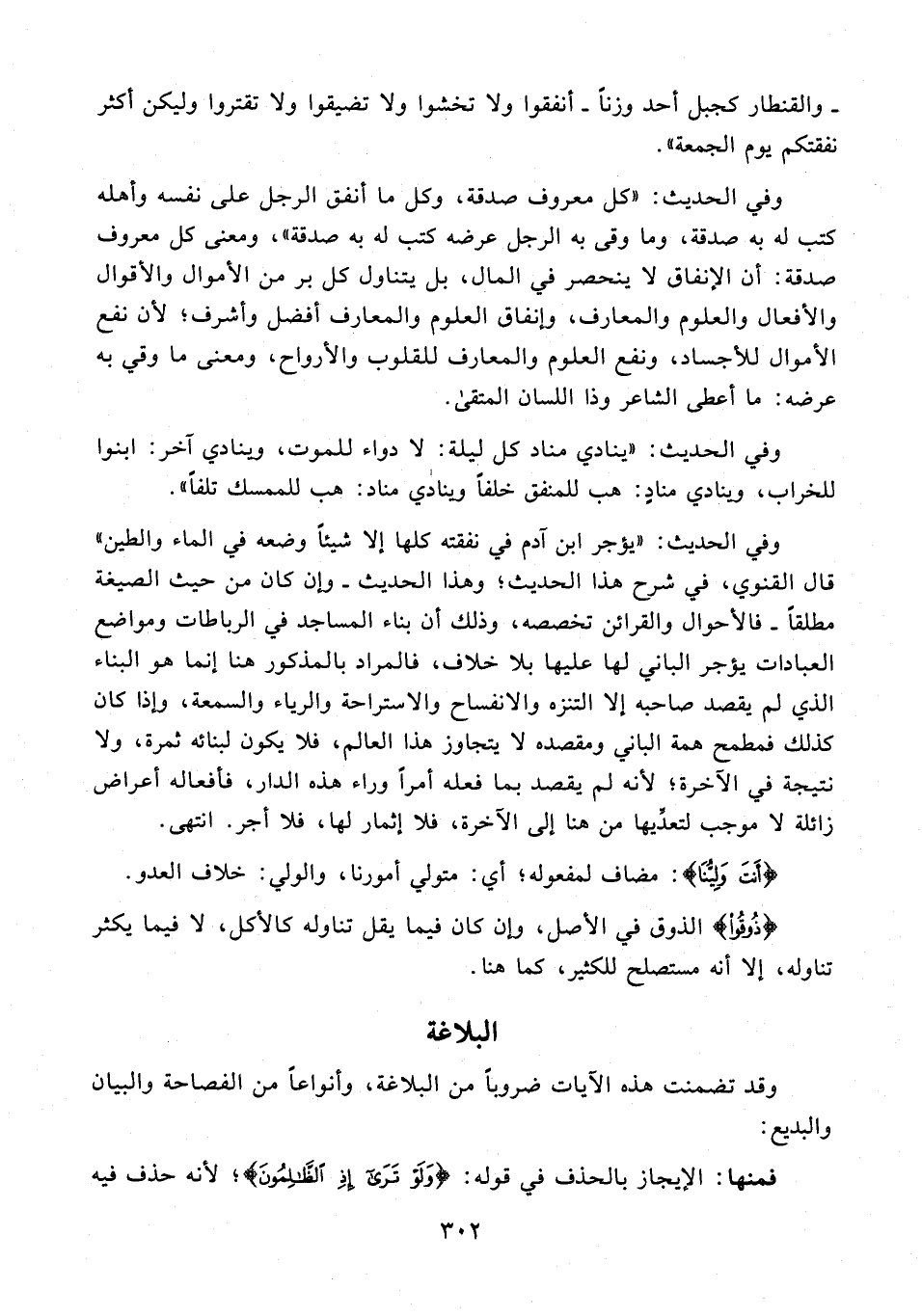 وفي الحديث: "كل معروف صدقة، وكل ما أنفق الرجل على نفسه وأهله كتب له به صدقة، وما وقى به الرجل عرضه كتب له به صدقة"، ومعنى كل معروف صدقة: أن الإنفاق لا ينحصر في المال، بل يتناول كل بر من الأموال والأقوال والأفعال والعلوم والمعارف، وإنفاق العلوم والمعارف أفضل وأشرف؛ لأن نفع الأموال للأجساد، ونفع العلوم والمعارف للقلوب والأرواح، ومعنى ما وقي به عرضه: ما أعطى الشاعر وذا اللسان المتقى.