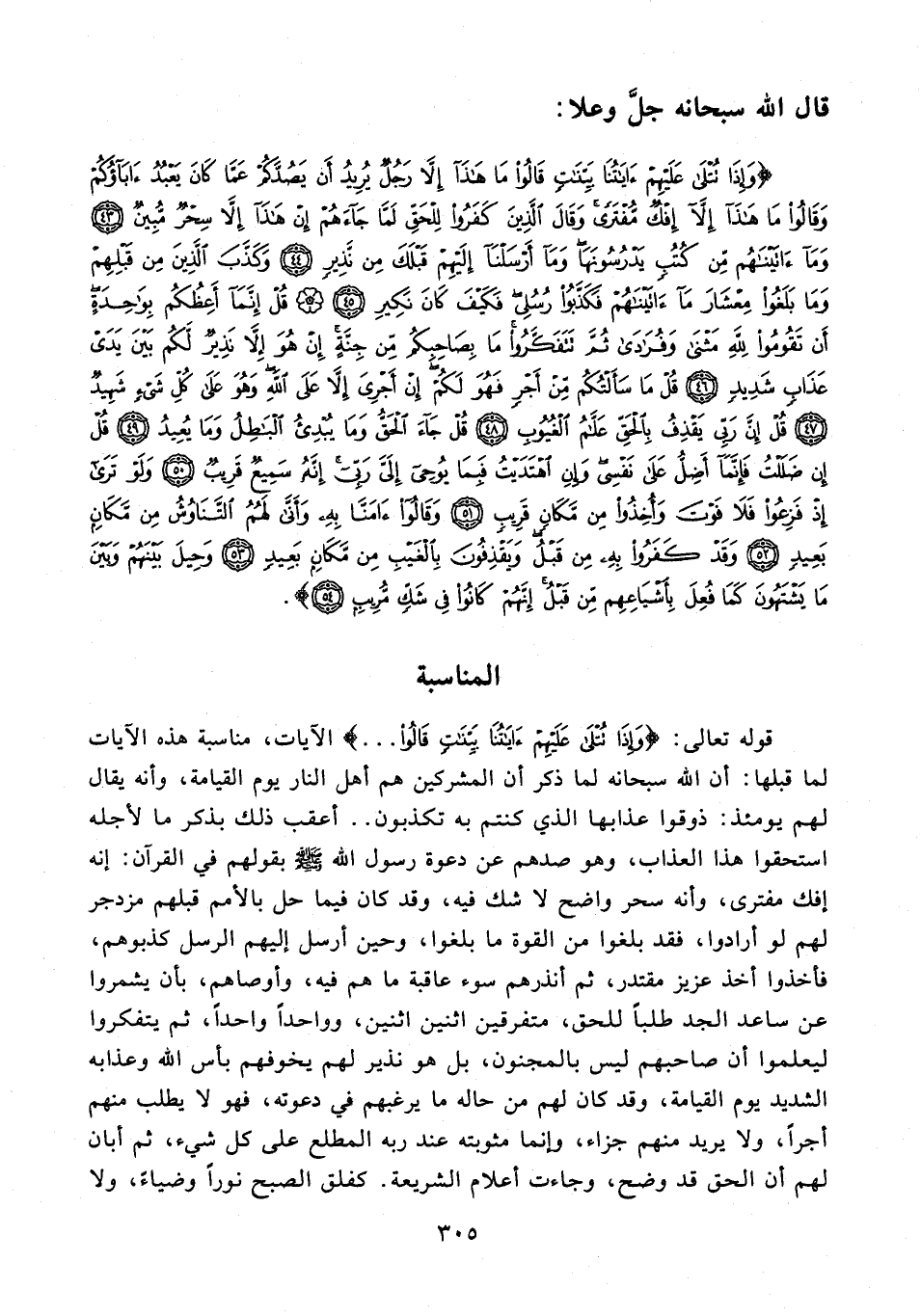 {وَإِذَا تُتْلَى عَلَيْهِمْ آيَاتُنَا بَيِّنَاتٍ قَالُوا مَا هَذَا إِلَّا رَجُلٌ يُرِيدُ أَنْ يَصُدَّكُمْ عَمَّا كَانَ يَعْبُدُ آبَاؤُكُمْ وَقَالُوا مَا هَذَا إِلَّا إِفْكٌ مُفْتَرًى وَقَالَ الَّذِينَ كَفَرُوا لِلْحَقِّ لَمَّا جَاءَهُمْ إِنْ هَذَا إِلَّا سِحْرٌ مُبِينٌ (43) وَمَا آتَيْنَاهُمْ مِنْ كُتُبٍ يَدْرُسُونَهَا وَمَا أَرْسَلْنَا إِلَيْهِمْ قَبْلَكَ مِنْ نَذِيرٍ (44) وَكَذَّبَ الَّذِينَ مِنْ قَبْلِهِمْ وَمَا بَلَغُوا مِعْشَارَ مَا آتَيْنَاهُمْ فَكَذَّبُوا رُسُلِي فَكَيْفَ كَانَ نَكِيرِ (45) قُلْ إِنَّمَا أَعِظُكُمْ بِوَاحِدَةٍ أَنْ تَقُومُوا لِلَّهِ مَثْنَى وَفُرَادَى ثُمَّ تَتَفَكَّرُوا مَا بِصَاحِبِكُمْ مِنْ جِنَّةٍ إِنْ هُوَ إِلَّا نَذِيرٌ لَكُمْ بَيْنَ يَدَيْ عَذَابٍ شَدِيدٍ (46) قُلْ مَا سَأَلْتُكُمْ مِنْ أَجْرٍ فَهُوَ لَكُمْ إِنْ أَجْرِيَ إِلَّا عَلَى اللَّهِ وَهُوَ عَلَى كُلِّ شَيْءٍ شَهِيدٌ (47) قُلْ إِنَّ رَبِّي يَقْذِفُ بِالْحَقِّ عَلَّامُ الْغُيُوبِ (48) قُلْ جَاءَ الْحَقُّ وَمَا يُبْدِئُ الْبَاطِلُ وَمَا يُعِيدُ (49) قُلْ إِنْ ضَلَلْتُ فَإِنَّمَا أَضِلُّ عَلَى نَفْسِي وَإِنِ اهْتَدَيْتُ فَبِمَا يُوحِي إِلَيَّ رَبِّي إِنَّهُ سَمِيعٌ قَرِيبٌ (50) وَلَوْ تَرَى إِذْ فَزِعُوا فَلَا فَوْتَ وَأُخِذُوا مِنْ مَكَانٍ قَرِيبٍ (51) وَقَالُوا آمَنَّا بِهِ وَأَنَّى لَهُمُ التَّنَاوُشُ مِنْ مَكَانٍ بَعِيدٍ (52) وَقَدْ كَفَرُوا بِهِ مِنْ قَبْلُ وَيَقْذِفُونَ بِالْغَيْبِ مِنْ مَكَانٍ بَعِيدٍ (53) وَحِيلَ بَيْنَهُمْ وَبَيْنَ مَا يَشْتَهُونَ كَمَا فُعِلَ بِأَشْيَاعِهِمْ مِنْ قَبْلُ إِنَّهُمْ كَانُوا فِي شَكٍّ مُرِيبٍ (54)}.