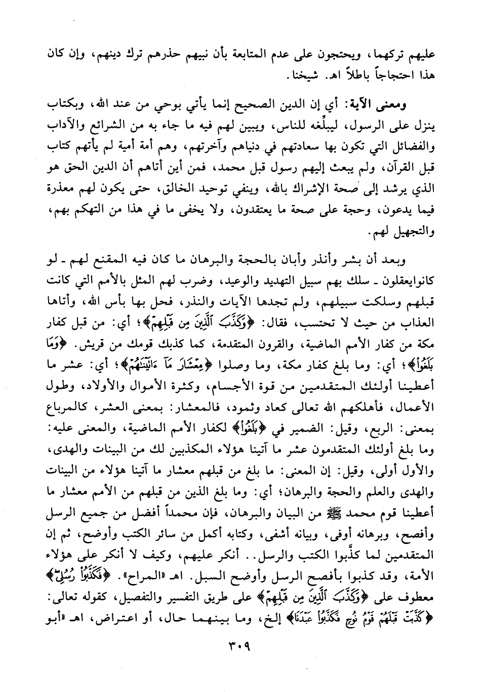 ومعنى الآية: أي إن الدين الصحيح إنما يأتي بوحي من عند الله، وبكتاب يتزل على الرسول، ليبلِّغه للناس، ويبين لهم فيه ما جاء به من الشرائع والآداب والفضائل التي تكون بها سعادتهم في دنياهم وآخرتهم، وهم أمة أمية لم يأتهم كتاب قبل القرآن، ولم يبعث إليهم رسول قبل محمد، فمن أين أتاهم أن الدين الحق هو الذي يرشد إلى صحة الإشراك بالله، وينفي توحيد الخالق، حتى يكون لهم معذرة فيما يدعون، وحجة على صحة ما يعتقدون، ولا يخفى ما في هذا من التهكم بهم، والتجهيل لهم.