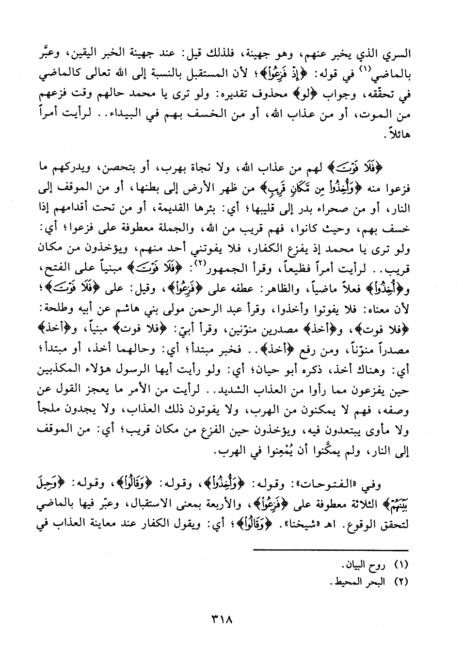 السري الذي يخبر عنهم، وهو جهينة، فلذلك قيل: عند جهينة الخبر اليقين، وعبَّر بالماضي (¬1) في قوله: {إِذْ فَزِعُوا}؛ لأن المستقبل بالنسبة إلى الله تعالى كالماضي في تحقّقه، وجواب {لَوْ} محذوف تقديره: ولو ترى يا محمد حالهم وقت فزعهم من الموت، أو من عذاب الله، أو من الخسف بهم في البيداء .. لرأيت أمرًا هائلًا.