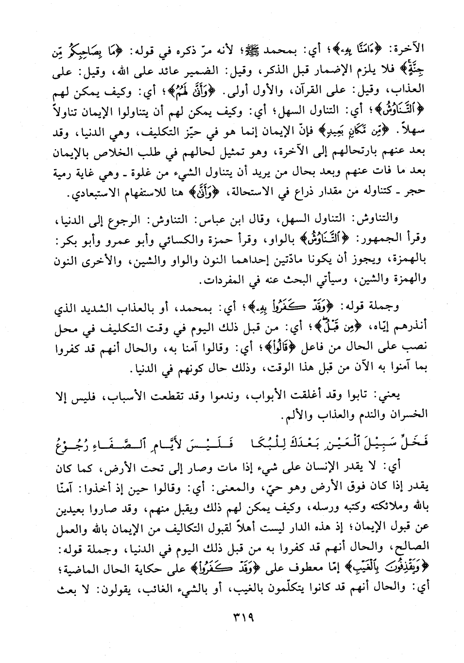 الآخرة: {آمَنَّا بِهِ}؛ أي: بمحمد - صلى الله عليه وسلم -؛ لأنه مرّ ذكره في قوله: {مَا بِصَاحِبِكُمْ مِنْ جِنَّةٍ} فلا يلزم الإضمار قبل الذكر، وقيل: الضمير عائد على الله، وقيل: على العذاب، وقيل: على القرآن، والأول أولى. {وَأَنَّى لَهُمُ}؛ أي: وكيف يمكن لهم {التَّنَاوُشُ}؛ أي: التناول السهل؛ أي: وكيف يمكن لهم أن يتناولوا الإيمان تناولًا سهلًا. {مِنْ مَكَانٍ بَعِيدٍ} فإنّ الإيمان إنما هو في حيّز التكليف، وهي الدنيا، وقد بعد عنهم بارتحالهم إلى الآخرة، وهو تمثيل لحالهم في طلب الخلاص بالإيمان بعدما فات عنهم وبعد بحال من يريد أن يتناول الشيء من غلوة - وهي غاية رمية حجر - كتناوله من مقدار ذراع في الاستحالة، {وَأَنَّى} هنا للاستفهام الاستبعادي.