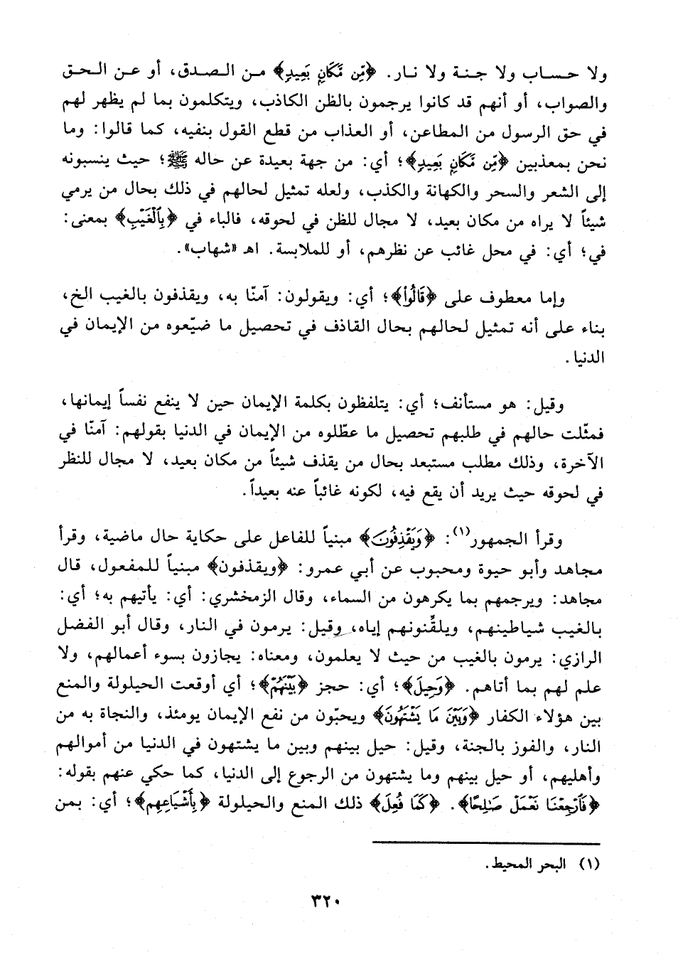 وقرأ الجمهور (¬1): {وَيَقْذِفُونَ} مبنيًا للفاعل على حكاية حال ماضية، وقرأ مجاهد وأبو حيوة ومحبوب عن أبي عمرو: {وَيَقْذِفُونَ} مبنيًا للمفعول، قال مجاهد: ويرجمهم بما يكرون من السماء، وقال الزمخشري: أي: يأتيهم به؛ أي: بالغيب شياطينهم، ويلقِّنونهم إياه، صوقيل: يرمون في النار، وقال أبو الفضل الرازي: يرمون بالغيب من حيث لا يعلمون، ومعناه: يجازون بسوء أعمالهم، ولا علم لهم بما أتاهم.