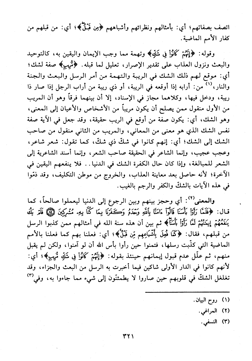 وقوله: {إِنَّهُمْ كَانُوا فِي شَكٍّ} وتهمة مما وجب الإيمان واليقين به، كالتوحيد والبعث ونزول العذاب على تقدير الإصرار، تعليل لما قبله. {مُرِيبٍ} صفة لشك؛ أي: موقع لهم ذلك الشك في الريبة والتهمة من أمر الرسل والبعث والجنة والنار، (¬1) من: أرابه إذا أوقعه في الريبة، أو ذي ريبة من أراب الرجل إذا صار ذا ريبة، ودخل فيها، وكلاهما مجاز في الإسناد، إلا أن بينهما فرقًا وهو أن المريب من الأول منقول ممن يصلح أن يكون مريبًا من الأشخاص والأعيان إلى المعنى، وهو الشك، أي: يكون صفة من أوقع في الريب حقيقة، وقد جعل في الآية صفة نفس الشك الذي هو معنى من المعاني، والمريب من الثاني منقول من صاحب الشك إلى الشك؛ أي: إنهم كانوا في شكّ ذي شكّ، كما تقول: شعر شاعر، وعجب عجيب، وإنما الشاعر في الحقيقة صاحب الشعر، وإنما أسند الشاعرية إلى الشعر للمبالغة، وإذا كان حال الكفرة الشك في الدنيا .. فلا ينفعهم اليقين في الآخرة؛ لأنه حاصل بعد معاينة العذاب، والخروج من موطن التكليف، وقد ذمّوا في هذه الآيات بالشكّ والكفر والرجم بالغيب.