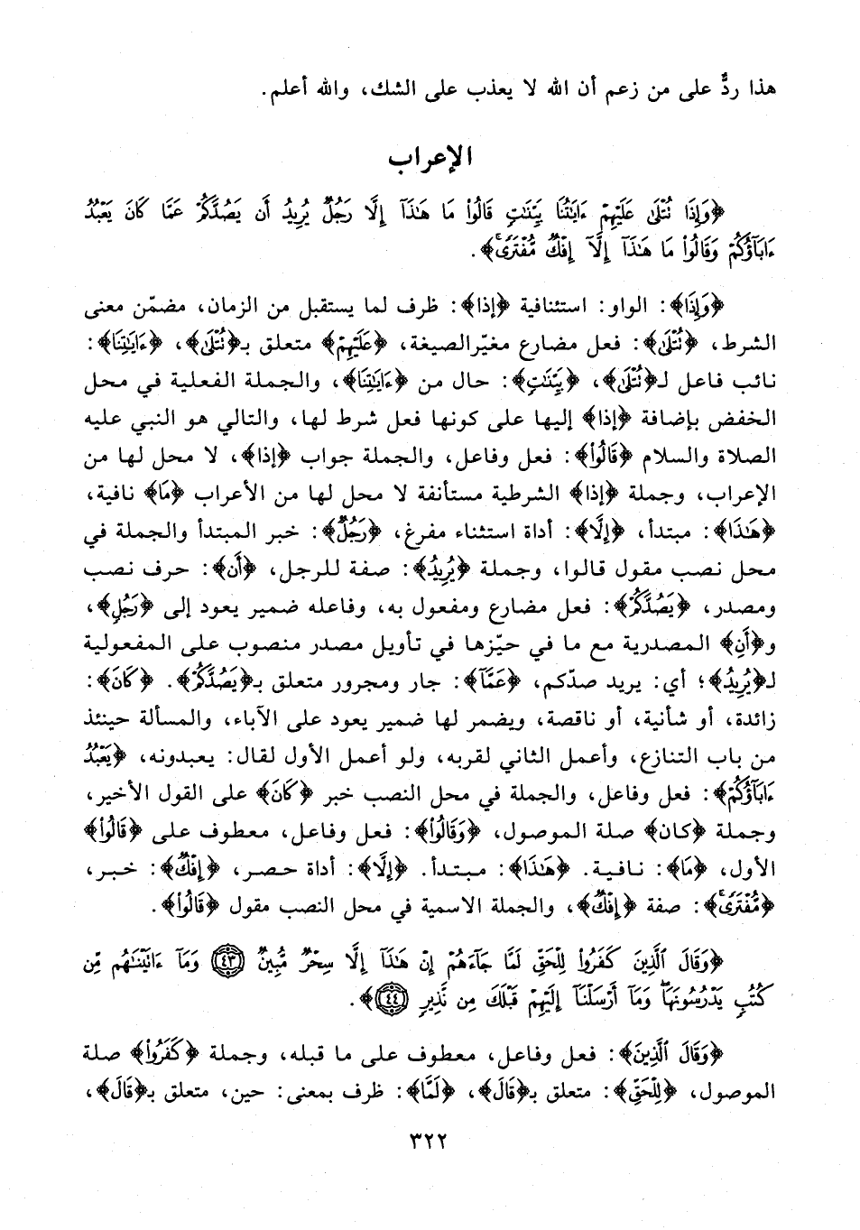{وَإِذَا}: الواو: استئنافية {إِذَا}: ظرف لما يستقبل من الزمان، مضمّن معنى الشرط، {تُتْلَى}: فعل مضارع مغيّر الصيغة، {عَلَيْهِمْ} متعلق بـ {تُتْلَى}، {آيَاتُنَا}: نائب فاعل لـ {تُتْلَى}، {بَيِّنَاتٍ}: حال من {آيَاتُنَا}، والجملة الفعلية في محل الخفض بإضافة {إذا} إليها على كونها فعل شرط لها، والتالي هو النبي عليه الصلاة والسلام {قَالُوا}: فعل وفاعل، والجملة جواب {إذا}، لا محل لها من الإعراب، وجملة {إذا} الشرطية مستأنفة لا محل لها من الأعراب {مَا} نافية، {هَذَا}: مبتدأ، {إِلَّا}: أداة استثناء مفرغ، {رَجُلٌ}: خبر المبتدأ والجملة في محل نصب مقول قالوا، وجملة {يُرِيدُ}: صفة للرجل، {أَنْ}: حرف نصب ومصدر، {يَصُدَّكُمْ}: فعل مضارع ومفعول به، وفاعله ضمير يعود إلى {رَجُلٌ}، و {أَنْ} المصدرية مع ما في حيّزها في تأويل مصدر منصوب على المفعولية لـ {يُرِيدُ}؛ أي: يريد صدّكم، {عَمَّا}: جار ومجرور متعلق بـ {يَصُدَّكُمْ}. {كَانَ}: زائدة، أو شأنية، أو ناقصة، ويضمر لها ضمير يعود على الآباء، والمسألة حينئذ من باب التنازع، وأعمل الثاني لقربه، ولو أعمل الأول لقال: يعبدونه، {يَعْبُدُ آبَاؤُكُمْ}: فعل وفاعل، والجملة في محل النصب خبر {كَانَ} على القول الأخير، وجملة {كَانَ} صلة الموصول، {وَقَالُوا}: فعل وفاعل، معطوف على {قَالُوا} الأول، {مَا}: نافية. {هَذَا}: مبتدأ. {إِلَّا}: أداة حصر، {إِفْكٌ}: خبر، {مُفْتَرًى}: صفة {إِفْكٌ}، والجملة الاسمية في محل النصب مقول {قَالُوا}.