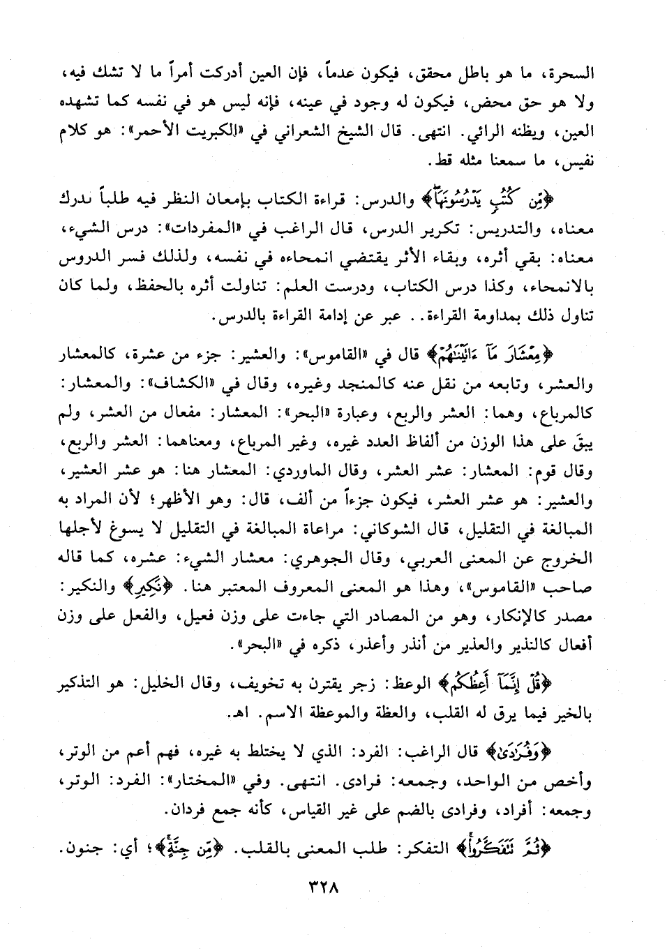 {مِعْشَارَ مَا آتَيْنَاهُمْ} قال في "القاموس": والعشير: جزء من عشرة، كالمعشار والعشر، وتابعه من نقل عنه كالمنجد وغيره، وقال في "الكشاف": والمعشار: كالمرباع، وهما: العشر والربع، وعبارة "البحر": المعشار: مفعال من العشر، ولم يبقَ على هذا الوزن من ألفاظ العدد غيره، وغير المرباع، ومعناهما: العشر والربع، وقال قوم: المعشار: عشر العشر، وقال الماوردي: المعشار هنا: هو عشر العشير، والعشير: هو عشر العشر، فيكون جزءًا من ألف، قال: وهو الأظهر؛ لأن المراد به المبالغة في التقليل، قال الشوكاني: مراعاة المبالغة في التقليل لا يسوغ لأجلها الخروج عن المعنى العربي، وقال الجوهري: معشار الشيء: عشره، كما قاله صاحب "القاموس"، وهذا هو المعنى المعروف المعتبر هنا. {نَكِيرِ} والنكير: مصدر كالإنكار، وهو من المصادر التي جاءت على وزن فعيل، والفعل على وزن أفعال كالنذير والعذير من أنذر وأعذر، ذكره في "البحر".