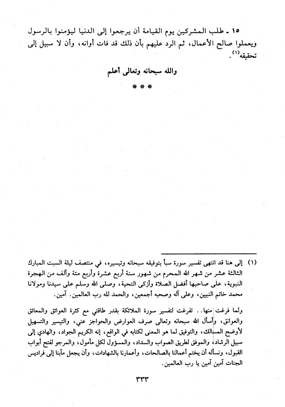 (¬1) إلى هنا قد انتهى تفسير سورة سبأ بتوفيقه سبحانه وتيسيره، في منتصف ليلة السبت المبارك الثالثة عشر من شهر الله المحرم من شهور سنة أربع عشرة وأربع مئة وألف من الهجرة النبوية، على صاحبها أفضل الصلاة وأزكى التحية، وصلى الله وسلم على سيدنا ومولانا محمد خاتم النيين، وعلى آله وصحبه أجمعين، والحمد لله رب العالمين. آمين.