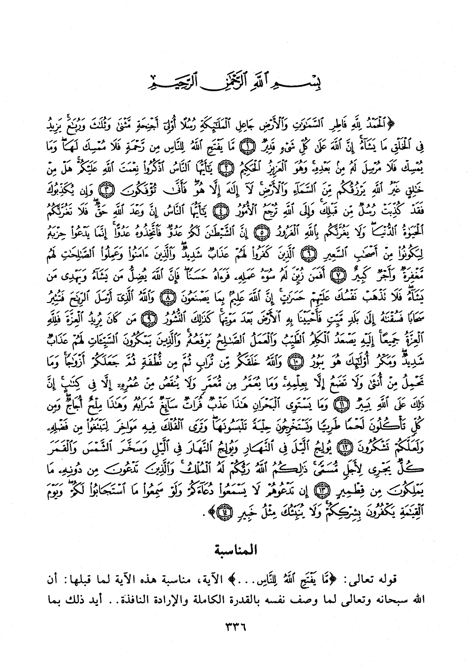 {الْحَمْدُ لِلَّهِ فَاطِرِ السَّمَاوَاتِ وَالْأَرْضِ جَاعِلِ الْمَلَائِكَةِ رُسُلًا أُولِي أَجْنِحَةٍ مَثْنَى وَثُلَاثَ وَرُبَاعَ يَزِيدُ فِي الْخَلْقِ مَا يَشَاءُ إِنَّ اللَّهَ عَلَى كُلِّ شَيْءٍ قَدِيرٌ (1) مَا يَفْتَحِ اللَّهُ لِلنَّاسِ مِنْ رَحْمَةٍ فَلَا مُمْسِكَ لَهَا وَمَا يُمْسِكْ فَلَا مُرْسِلَ لَهُ مِنْ بَعْدِهِ وَهُوَ الْعَزِيزُ الْحَكِيمُ (2) يَا أَيُّهَا النَّاسُ اذْكُرُوا نِعْمَتَ اللَّهِ عَلَيْكُمْ هَلْ مِنْ خَالِقٍ غَيْرُ اللَّهِ يَرْزُقُكُمْ مِنَ السَّمَاءِ وَالْأَرْضِ لَا إِلَهَ إِلَّا هُوَ فَأَنَّى تُؤْفَكُونَ (3) وَإِنْ يُكَذِّبُوكَ فَقَدْ كُذِّبَتْ رُسُلٌ مِنْ قَبْلِكَ وَإِلَى اللَّهِ تُرْجَعُ الْأُمُورُ (4) يَا أَيُّهَا النَّاسُ إِنَّ وَعْدَ اللَّهِ حَقٌّ فَلَا تَغُرَّنَّكُمُ الْحَيَاةُ الدُّنْيَا وَلَا يَغُرَّنَّكُمْ بِاللَّهِ الْغَرُورُ (5) إِنَّ الشَّيْطَانَ لَكُمْ عَدُوٌّ فَاتَّخِذُوهُ عَدُوًّا إِنَّمَا يَدْعُو حِزْبَهُ لِيَكُونُوا مِنْ أَصْحَابِ السَّعِيرِ (6) الَّذِينَ كَفَرُوا لَهُمْ عَذَابٌ شَدِيدٌ وَالَّذِينَ آمَنُوا وَعَمِلُوا الصَّالِحَاتِ لَهُمْ مَغْفِرَةٌ وَأَجْرٌ كَبِيرٌ (7) أَفَمَنْ زُيِّنَ لَهُ سُوءُ عَمَلِهِ فَرَآهُ حَسَنًا فَإِنَّ اللَّهَ يُضِلُّ مَنْ يَشَاءُ وَيَهْدِي مَنْ يَشَاءُ فَلَا تَذْهَبْ نَفْسُكَ عَلَيْهِمْ حَسَرَاتٍ إِنَّ اللَّهَ عَلِيمٌ بِمَا يَصْنَعُونَ (8) وَاللَّهُ الَّذِي أَرْسَلَ الرِّيَاحَ فَتُثِيرُ سَحَابًا فَسُقْنَاهُ إِلَى بَلَدٍ مَيِّتٍ فَأَحْيَيْنَا بِهِ الْأَرْضَ بَعْدَ مَوْتِهَا كَذَلِكَ النُّشُورُ (9) مَنْ كَانَ يُرِيدُ الْعِزَّةَ فَلِلَّهِ الْعِزَّةُ جَمِيعًا إِلَيْهِ يَصْعَدُ الْكَلِمُ الطَّيِّبُ وَالْعَمَلُ الصَّالِحُ يَرْفَعُهُ وَالَّذِينَ يَمْكُرُونَ السَّيِّئَاتِ لَهُمْ عَذَابٌ شَدِيدٌ وَمَكْرُ أُولَئِكَ هُوَ يَبُورُ (10) وَاللَّهُ خَلَقَكُمْ مِنْ تُرَابٍ ثُمَّ مِنْ نُطْفَةٍ ثُمَّ جَعَلَكُمْ أَزْوَاجًا وَمَا تَحْمِلُ مِنْ أُنْثَى وَلَا تَضَعُ إِلَّا بِعِلْمِهِ وَمَا يُعَمَّرُ مِنْ مُعَمَّرٍ وَلَا يُنْقَصُ مِنْ عُمُرِهِ إِلَّا فِي كِتَابٍ إِنَّ ذَلِكَ عَلَى اللَّهِ يَسِيرٌ (11) وَمَا يَسْتَوِي الْبَحْرَانِ هَذَا عَذْبٌ فُرَاتٌ سَائِغٌ شَرَابُهُ وَهَذَا مِلْحٌ أُجَاجٌ وَمِنْ كُلٍّ تَأْكُلُونَ لَحْمًا طَرِيًّا وَتَسْتَخْرِجُونَ حِلْيَةً تَلْبَسُونَهَا وَتَرَى الْفُلْكَ فِيهِ مَوَاخِرَ لِتَبْتَغُوا مِنْ فَضْلِهِ وَلَعَلَّكُمْ تَشْكُرُونَ (12) يُولِجُ اللَّيْلَ فِي النَّهَارِ وَيُولِجُ النَّهَارَ فِي اللَّيْلِ وَسَخَّرَ الشَّمْسَ وَالْقَمَرَ كُلٌّ يَجْرِي لِأَجَلٍ مُسَمًّى ذَلِكُمُ اللَّهُ رَبُّكُمْ لَهُ الْمُلْكُ وَالَّذِينَ تَدْعُونَ مِنْ دُونِهِ مَا يَمْلِكُونَ مِنْ قِطْمِيرٍ (13) إِنْ تَدْعُوهُمْ لَا يَسْمَعُوا دُعَاءَكُمْ وَلَوْ سَمِعُوا مَا اسْتَجَابُوا لَكُمْ وَيَوْمَ الْقِيَامَةِ يَكْفُرُونَ بِشِرْكِكُمْ وَلَا يُنَبِّئُكَ مِثْلُ خَبِيرٍ (14)}.