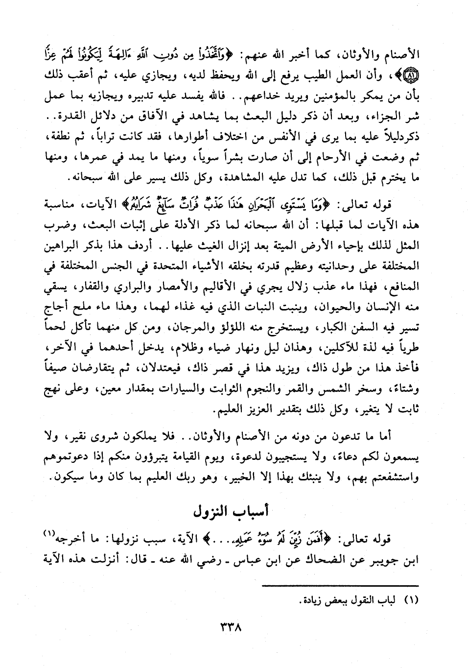 قوله تعالى: {وَمَا يَسْتَوِي الْبَحْرَانِ هَذَا عَذْبٌ فُرَاتٌ سَائِغٌ شَرَابُهُ} الآيات، مناسبة هذه الآيات لما قبلها: أن الله سبحانه لما ذكر الأدلة على إثبات البعث، وضرب المثل لذلك بإحياء الأرض الميتة بعد إنزال الغيث عليها .. أردف هذا بذكر البراهين المختلفة على وحدانيته وعظيم قدرته بخلقه الأشياء المتحدة في الجنس المختلفة في المنافع، فهذا ماء عذب زلال يجري في الأقاليم والأمصار والبراري والقفار، يسقي منه الإنسان والحيوان، وينبت النبات الذي فيه غذاء لهما، وهذا ماء ملح أجاجٍ تسير فيه السفن الكبار، ويستخرج منه اللؤلؤ والمرجان، ومن كل منهما تأكل لحمًا طريًا فيه لذة للآكلين، وهذان ليل ونهار ضياء وظلام، يدخل أحدهما في الآخر، فأخذ هذا من طول ذاك، ويزيد هذا في قصر ذاك، فيعتدلان، ثم يتقارضان صيفًا وشتاءً، وسخر الشمس والقمر والنجوم الثوابت والسيارات بمقدار معين، وعلى نهج ثابت لا يتغير، وكل ذلك بتقدير العزيز العلم.