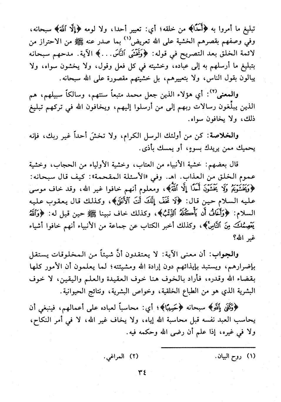 تبليغ ما أمروا به {أَحَدًا} من خلقه؛ أي: تعيير أحدا, ولا لومه {إِلَّا اللَّهَ} سبحانه، وفي وصفهم بقصرهم الخشية على الله تعريض (¬1) بما صدر عنه - صلى الله عليه وسلم - من الاحتراز من لائمة الخلق بعد التصريح في قوله: {وَتَخْشَى النَّاسَ ...} الآية. مدحهم سبحانه بتبليغ ما أرسلهم به إلى عباده، وخشيته في كل فعل وقول، ولا يخشون سواه، ولا يبالون بقول الناس، ولا بتعييرهم، بل خشيتهم مقصورة على الله سبحانه.