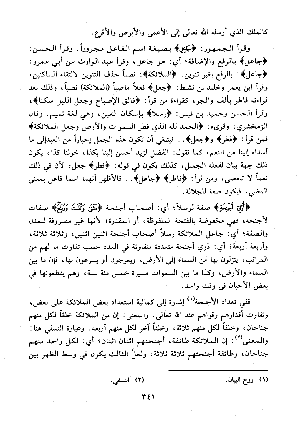 ففي تعداد الأجنحة (¬1) إشارة إلى كمالية استعداد بعض الملائكة على بعض، وتفاوت أقدارهم وقواهم عند الله تعالى. والمعنى: إن من الملائكة خلقًا لكل منهم جناحان، وخلقًا لكل منهم ثلاثة، وخلقًا آخر لكل منهم أربعة، وعبارة النسفي هنا: والمعنى (¬2): إن الملائكة طائفة، أجنحتهم اثنان اثنان؛ أي: لكل واحد منهم جناحان، وطائفة أجنحتهم ثلاثة ثلاثة، ولعلَّ الثالث يكون في وسط الظهر بين