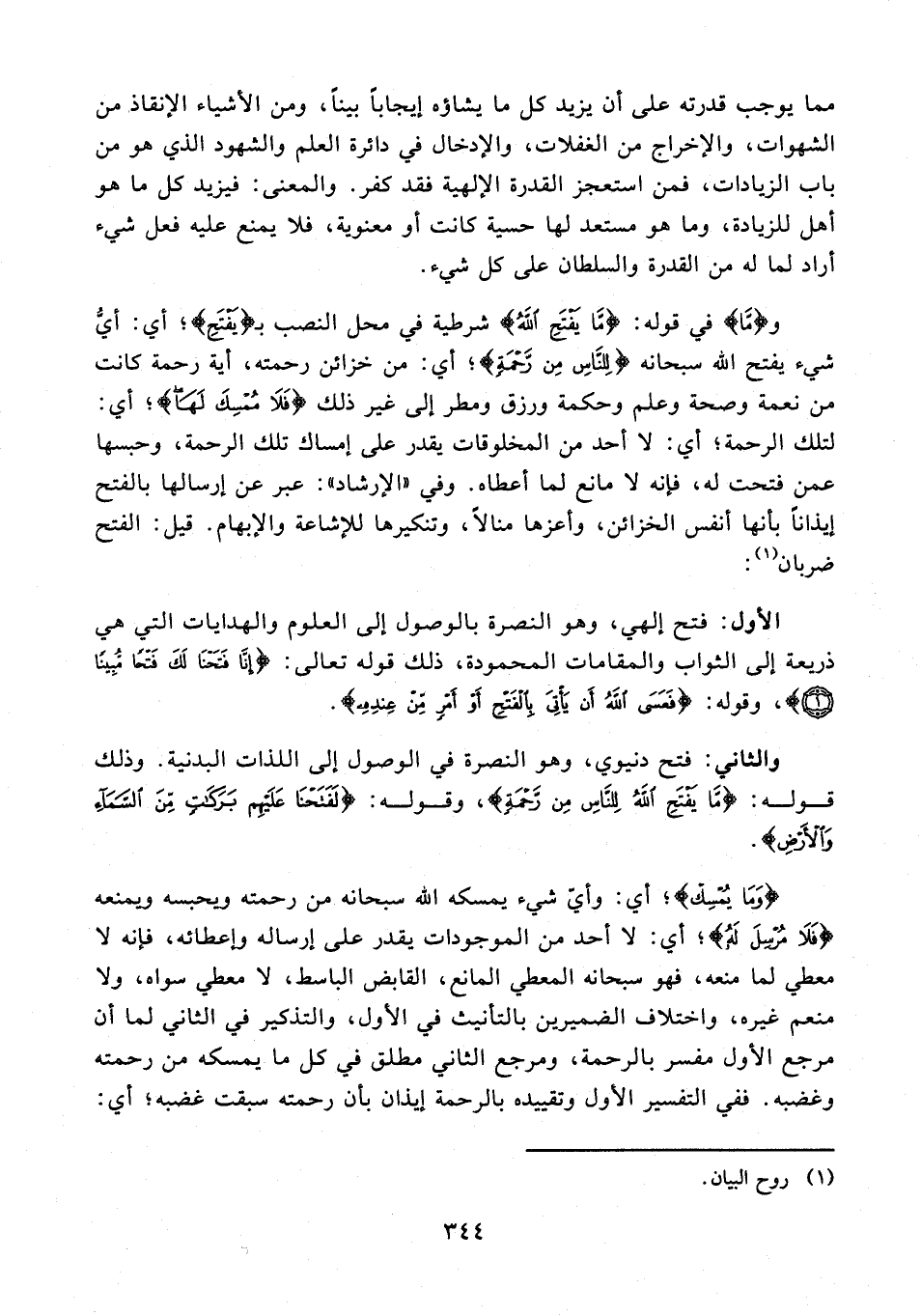 2 - و {مَا} في قوله: {مَا يَفْتَحِ اللَّهُ} شرطية في محل النصب بـ {يَفْتَحِ}؛ أي: أيُّ شيء يفتح الله سبحانه {لِلنَّاسِ مِنْ رَحْمَةٍ}؛ أي: من خزائن رحمته، أية رحمة كانت من نعمة وصحة وعلم وحكمة ورزق ومطر إلى غير ذلك {فَلَا مُمْسِكَ لَهَا}؛ أي: لتلك الرحمة؛ أي: لا أحد من المخلوقات يقدر على إمساك تلك الرحمة، وحبسها عمن فتحت له، فإنه لا مانع لما أعطاه. وفي "الإرشاد": عبر عن إرسالها بالفتح إيذانًا بأنها أنفس الخزائن، وأعزها منالًا، وتنكيرها للإشاعة والإبهام. قيل: الفتح ضربان (¬1):
