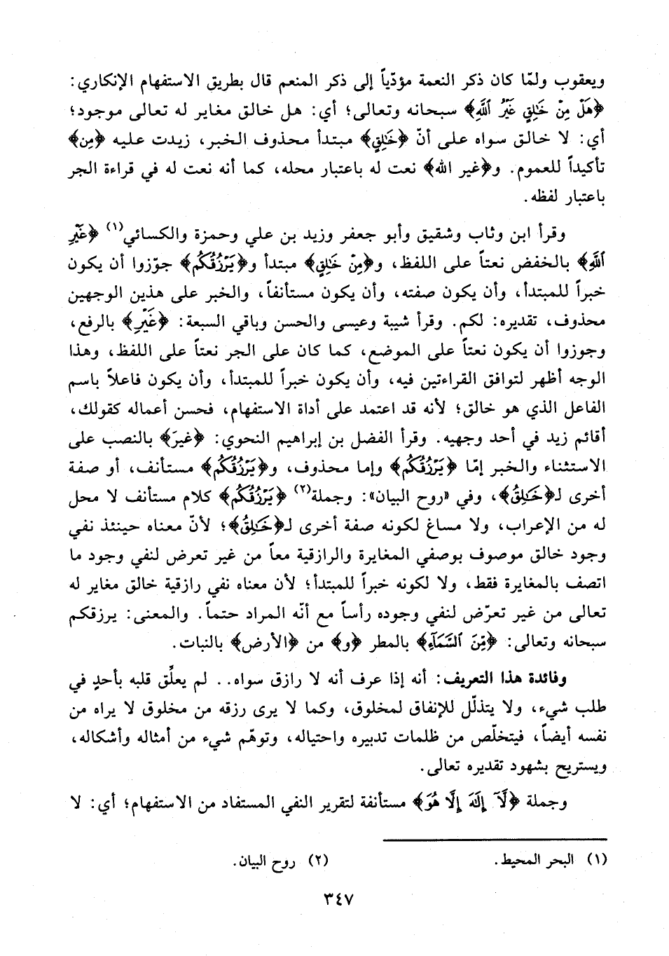 ويعقوب ولمّا كان ذكر النعمة مؤذيًا إلى ذكر المنعم قال بطريق الاستفهام الإنكاري: {هَلْ مِنْ خَالِقٍ غَيْرُ اللَّهِ} سبحانه وتعالى؛ أي: هل خالق مغاير له تعالى موجود؛ أي: لا خالق سواه على أن {خَالِقٍ} مبتدأ محذوف الخبر، زيدت عليه {مِنْ} تأكيدًا للعموم. و {غير الله} نعت له باعتبار محله، كما أنه نعت له في قراءة الجر باعتبار لفظه.