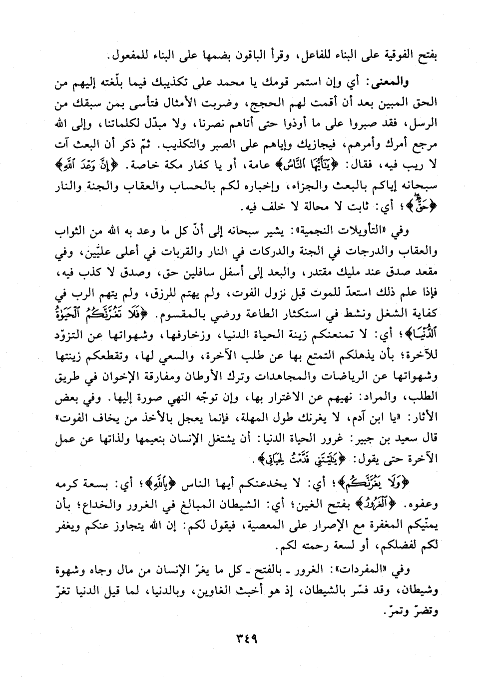 وفي "التأويلات النجمية": يشير سبحانه إلى أنّ كل ما وعد به الله من الثواب والعقاب والدرجات في الجنة والدركات في النار والقربات في أعلى عليّين، وفي مقعد صدق عند مليك مقتدر، والبعد إلى أسفل سافلين حق، وصدق لا كذب فيه، فإذا علم ذلك استعدّ للموت قبل نزول الفوت، ولم يهتم للرزق، ولم يتهم الرب في كفاية الشغل ونشط في استكثار الطاعة ورضي بالمقسوم. {فَلَا تَغُرَّنَّكُمُ الْحَيَاةُ الدُّنْيَا}؛ أي: لا تمنعنكم زينة الحياة الدنيا، وزخارفها، وشهواتها عن التزوّد للآخرة؛ بأن يذهلكم التتسع بها عن طلب الآخرة، والسعي لها، وتقطعكم زينتها وشهواتها عن الرياضات والمجاهدات وترك الأوطان ومفارقة الإخوان في طريق الطلب، والمراد: نهيهم عن الاغترار بها، وإن توجّه النهي صورة إليها. وفي بعض الآثار: "يا ابن آدم، لا يغرنك طول المهلة، فإنما يعجل بالأخذ من يخاف الفوت" قال سعيد بن جبير: غرور الحياة الدنيا: أن يشتغل الإنسان بنعيمها ولذاتها عن عمل الآخرة حتى يقول: {يَا لَيْتَنِي قَدَّمْتُ لِحَيَاتِي}.
