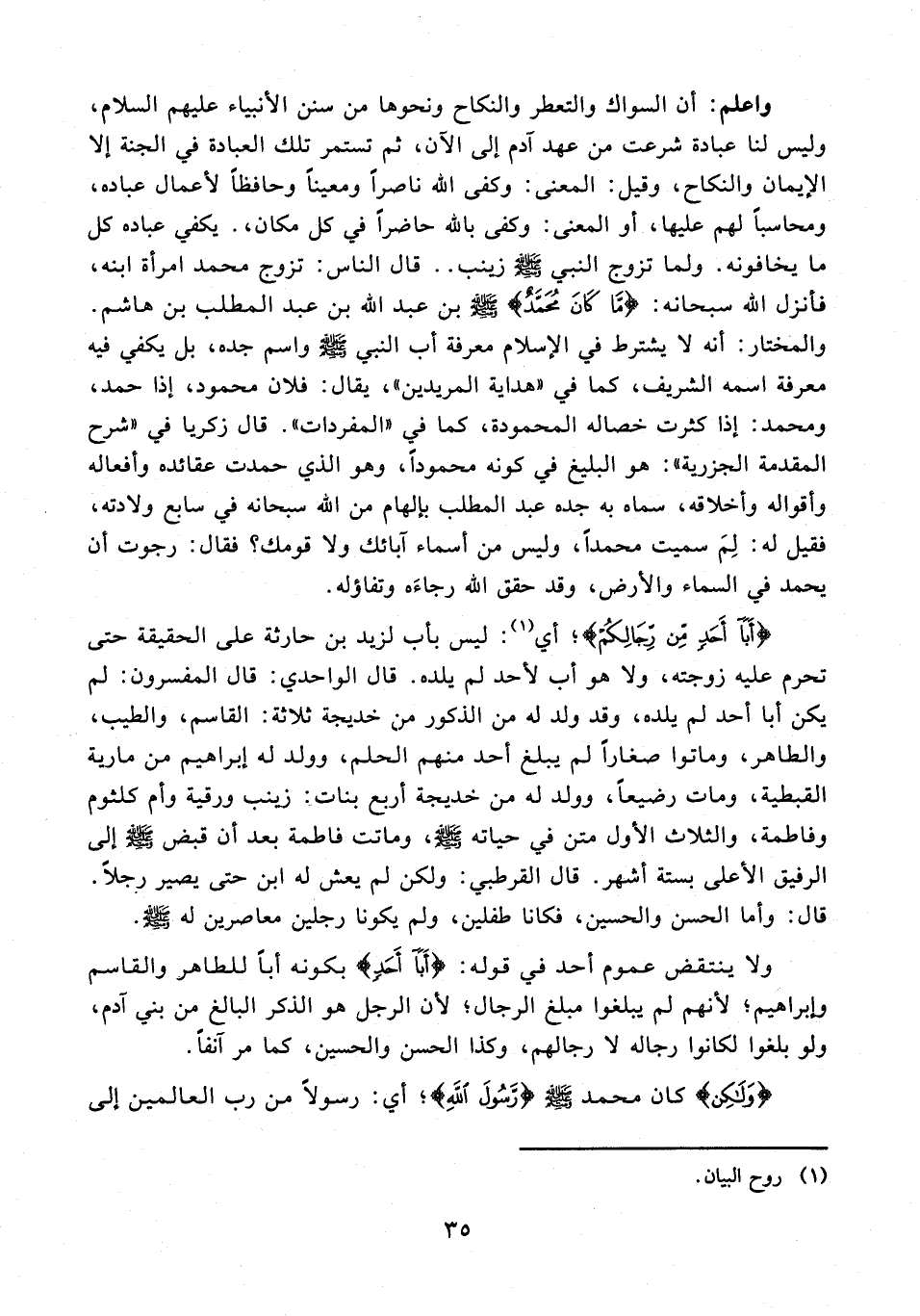 ولا ينتقض عموم أحد في قوله: {أَبَا أَحَدٍ} بكونه أبًا للطاهر والقاسم وإبراهيم؛ لأنهم لم يبلغوا مبلغ الرجال؛ لأن الرجل هو الذكر البالغ من بني آدم، ولو بلغوا لكانوا رجاله لا رجالهم، وكذا الحسن والحسين، كما مر آنفًا.
