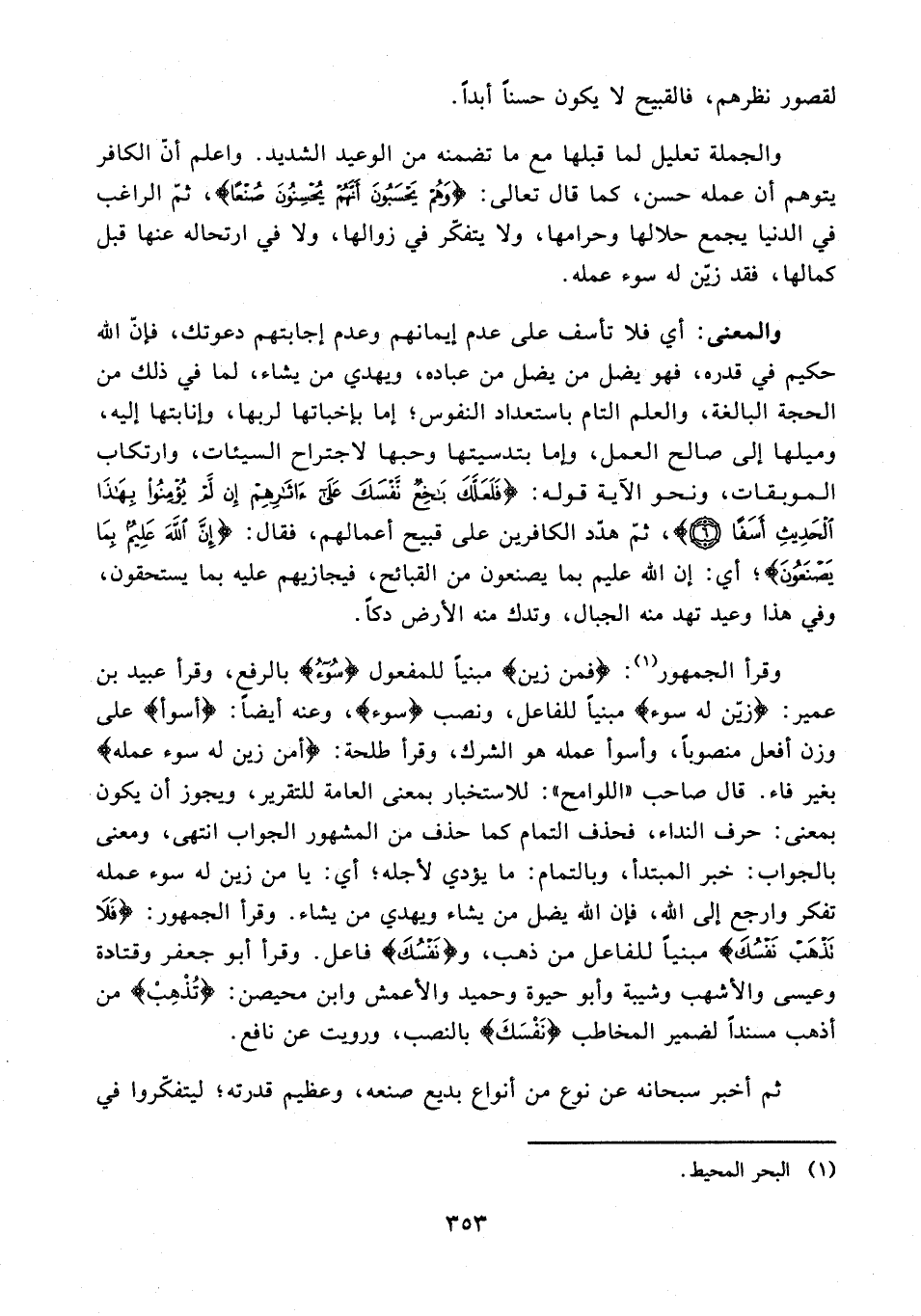 وقرأ الجمهور (¬1): {فمن زين} مبنيًا للمفعول {سُوءُ} بالرفع، وقرأ عبيد بن عمير: {زين له سوء} مبنيًا للفاعل، ونصب {سوء}، وعنه أيضًا: {أسوأ} على وزن أفعل منصوبًا، وأسوأ عمله هو الشرك، وقرأ طلحة: {أمن زين له سوء عمله} بغير فاء. قال صاحب "اللوامح": للاستخبار بمعنى العامة للتقرير، ويجوز أن يكون بمعنى: حرف النداء، فحذف التمام كما حذف من المشهور الجواب انتهى، ومعنى بالجواب: خبر المبتدأ، وبالتمام: ما يؤدي لأجله؛ أي: يا من زين له سوء عمله تفكر وارجع إلى الله، فإن الله يضل من يشاء ويهدي من يشاء. وقرأ الجمهور: {فَلَا تَذْهَبْ نَفْسُكَ} مبنيًا للفاعل من ذهب، و {نَفْسُكَ} فاعل. وقرأ أبو جعفر وقتادة وعيسى والأشهب وشيبة وأبو حيوة وحميد والأعمش وابن محيصن: {تُذْهِبْ} من أذهب مسندًا لضمير المخاطب {نَفْسُكَ} بالنصب، ورويت عن نافع.