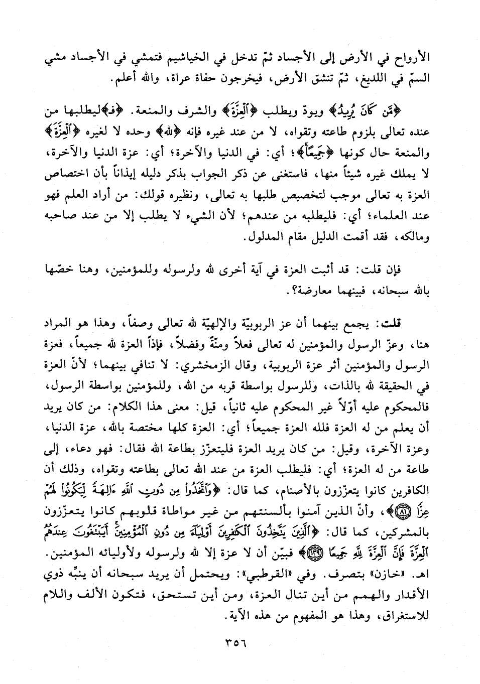 قلت: يجمع بينهما أن عز الربوبيّة والإلهيّة لله تعالى وصفًا، وهذا هو المراد هنا، وعزّ الرسول والمؤمنين له تعالى فعلًا ومنّةً وفضلًا، فإذًا العزة لله جميعًا، فعزة الرسول والمؤمنين أثر عزة الربوبية، وقال الزمخشري: لا تنافي بينهما؛ لأنّ العزة في الحقيقة لله بالذات، وللرسول بواسطة قربه من الله، وللمؤمنين بواسطة الرسول، فالمحكوم عليه أوّلًا غير المحكوم عليه ثانيًا، قيل: معنى هذا الكلام: من كان يريد أن يعلم من له العزة فلله العزة جميعًا؛ أي: العزة كلهامختصة بالله، عزة الدنيا، وعزة الآخرة، وقيل: من كان يريد العزة فليتعزّز بطاعة الله فقال: فهو دعاء، إلى طاعة من له العزة؛ أي: فليطلب العزة من عند الله تعالى بطاعته وتقواه، وذلك أن الكافرين كانوا يتعزّزون بالأصنام، كما قال: {وَاتَّخَذُوا مِنْ دُونِ اللَّهِ آلِهَةً لِيَكُونُوا لَهُمْ عِزًّا (81)}، وأنّ الذين آمنوا بألسنتهم من غير مواطاة قلوبهم كانوا يتعزّزون بالمشركين، كما قال: {الَّذِينَ يَتَّخِذُونَ الْكَافِرِينَ أَوْلِيَاءَ مِنْ دُونِ الْمُؤْمِنِينَ أَيَبْتَغُونَ عِنْدَهُمُ الْعِزَّةَ فَإِنَّ الْعِزَّةَ لِلَّهِ جَمِيعًا (139)} فبيّن أن لا عزة إلا لله ولرسوله ولأوليائه المؤمنين. اهـ. "خازن" بتصرف. وفي "القرطبي": ويحتمل أن يريد سبحانه أن ينبِّه ذوي الأقدار والهمم من أين تنال العزة، ومن أين تستحق، فتكون الألف واللام للاستغراق، وهذا هو المفهوم من هذه الآية.