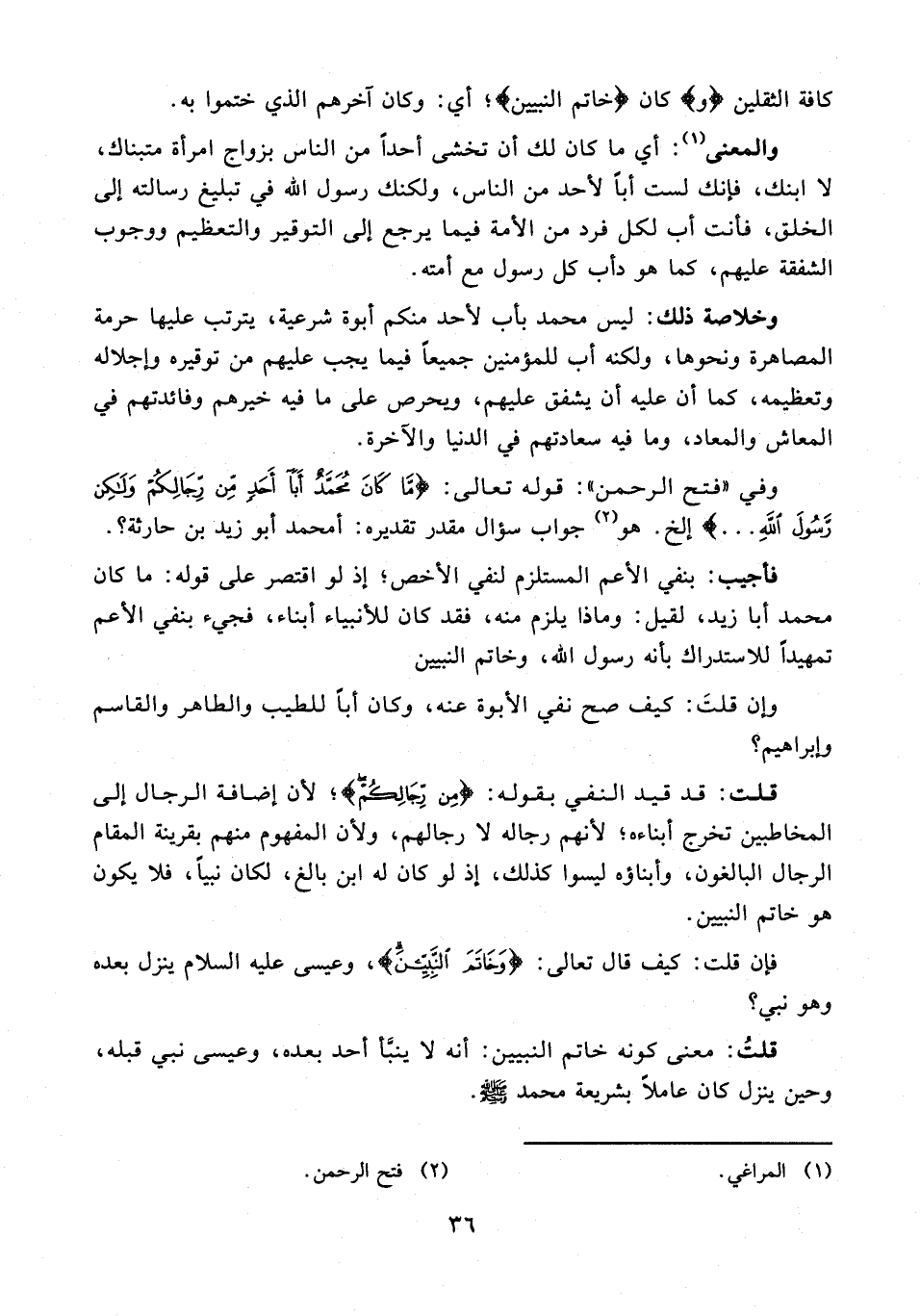 وفي "فتح الرحمن": قوله تعالى: {مَا كَانَ مُحَمَّدٌ أَبَا أَحَدٍ مِنْ رِجَالِكُمْ وَلَكِنْ رَسُولَ اللَّهِ ...} إلخ. هو (¬2) جواب سؤال مقدر تقديره: أمحمد أبو زيد بن حارثة؟.