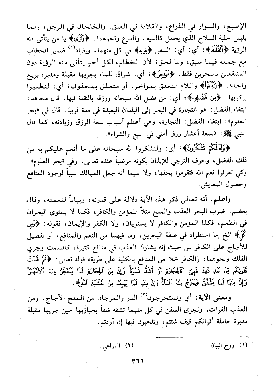 ومعنى الآية: أي وتستخرجون (¬2) الدر والمرجان من الملح الأجاج، ومن العذب الفرات، وتجري السفن في كل منهما تشقه شقًا بحيازيها حين جريها مقبلة مدبرة حاملة أقواتكم كيف شئتم، وتذهبون فيها إن أردتم.