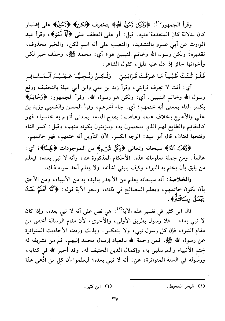 وقرأ الجمهور (¬1): {وَلَكِنْ رَسُولَ اللَّهِ} بتخفيف {لكن} {رَسُولَ} على إضمار كان لدلالة كان المتقدمة عليه. قيل: أو على العطف على {أَبَا أَحَدٍ}، وقرأ عبد الوارث عن أبي عمرو بالتشديد، والنصب على أنه اسم لكن، والخبر محذوف، تقديره: ولكن رسول الله وخاتم النبيين هو؛ أي: محمد - صلى الله عليه وسلم -، وحذف خبر لكن وأخواتها جائز إذا دل عليه دليل، كقول الشاعر: