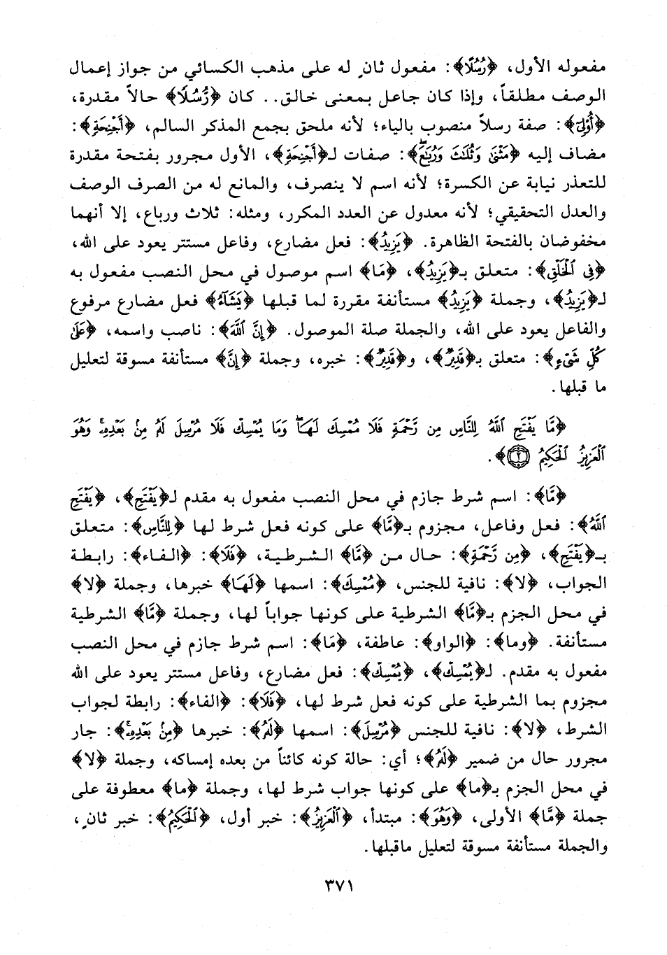 {مَا}: اسم شرط جازم في محل النصب مفعول به مقدم لـ {يَفْتَحِ}، {يَفْتَحِ اللَّهُ}: فعل وفاعل، مجزوم بـ {مَا} على كونه فعل شرط لها {لِلنَّاسِ}: متعلق بـ {يَفْتَحِ}، {مِنْ رَحْمَةٍ}: حال من {مَا} الشرطية، {فَلَا}: {الفاء}: رابطة الجواب، {لا}: نافية للجنس، {مُمْسِكَ}: اسمها {لَهَا} خبرها، وجملة {لا} في محل الجزم بـ {مَا} الشرطية على كونها جوابًا لها، وجملة {مَا} الشرطية مستأنفة. {وما}: {الواو}: عاطفة، {مَا}: اسم شرط جازم في محل النصب مفعول به مقدم. لـ {يُمسِك}، {يُمسِك}: فعل مضارع، وفاعل مستتر يعود على الله مجزوم بما الشرطية على كونه فعل شرط لها، {فَلَا}: {الفاء}: رابطة لجواب الشرط، {لا}: نافية للجنس {مُرْسِلَ}: اسمها {لَهُ}: خبرها {مِنْ بَعْدِهِ}: جار مجرور حال من ضمير {لَهُ}؛ أي: حالة كونه كائنًا من بعده إمساكه، وجملة {لا} في محل الجزم بـ {ما} على كونها جواب شرط لها، وجملة {ما} معطوفة على جملة {مَّا} الأولى، {وَهُوَ}: مبتدأ، {الْعَزِيزُ}: خبر أول، {الْحَكِيمُ}: خبر ثانٍ، والجملة مستأنفة مسوقة لتعليل ما قبلها.