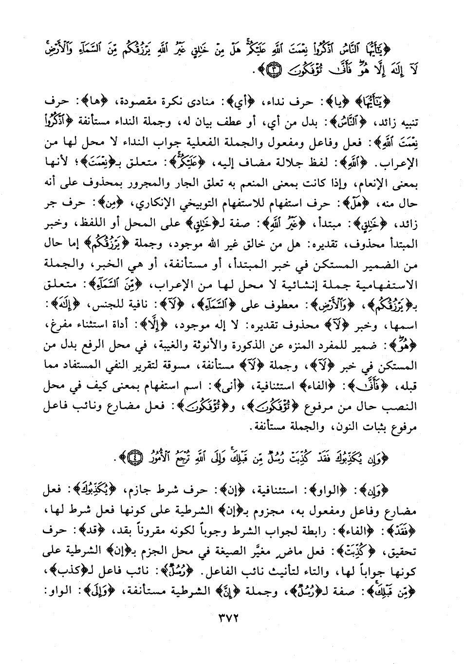 {يَا أَيُّهَا} {يا}: حرف نداء، {أي}: منادى نكرة مقصودة، {ها}: حرف تنبيه زائد، {النَّاسُ}: بدل من أي، أو عطف بيان له، وجملة النداء مستأنفة {اذْكُرُوا نِعْمَتَ اللَّهِ}: فعل وفاعل ومفعول والجملة الفعلية جواب النداء لا محل لها من الإعراب. {اللَّهِ}: لفظ جلالة مضاف إليه، {عَلَيْكُمْ}: متعلق بـ {نِعْمَتَ}؛ لأنها بمعنى الإنعام، وإذا كانت بمعنى المنعم به تعلق الجار والمجرور بمحذوف على أنه حال منه، {هَلْ}: حرف للاستفهام التوبيخي الإنكارى , {مِنْ}: حرف جر زائد، {خَالِقٍ}: مبتدأ، {غَيْرُ اللَّهِ}: صفة لـ {خَالِقٍ} على المحل أو اللفظ، وخبر المبتدأ محذوف، تقديره: هل من خالق غير الله موجود، وجملة {يَرْزُقُكُمْ} إما حال من الضمير المستكن في خبر المبتدأ، أو مستأنفة، أو هي الخبر، والجملة الاستفهامية جملة إنشائية لا محل لها من الإعراب، {مِنَ السَّمَاءِ}: متعلق بـ {يَرْزُقُكُمْ}، {وَالْأَرْضِ}: معطوف على {السَّمَاءِ}، {لَا}: نافية للجنس، {إِلَهَ}: اسمها، وخبر {لَا} محذوف تقديره: لا إله موجود، {إِلَّا}: أداة استثناء مفرغ، {هُوَ}: ضمير للمفرد المنزه عن الذكورة والأنوثة والغيبة، في محل الرفع بدل من المستكن في خبر {لَا}، وجملة {لَا} مستأنفة، مسوقة لتقرير النفي المستفاد مما قبله، {فَأَنَّى}: {الفاء} استئنافية، {أنى}: اسم استفهام بمعنى كيف في محل النصب حال من مرفوع {تُؤْفَكُونَ}، و {تُؤْفَكُونَ}: فعل مضارع ونائب فاعل مرفوع بثبات النون، والجملة مستأنفة.